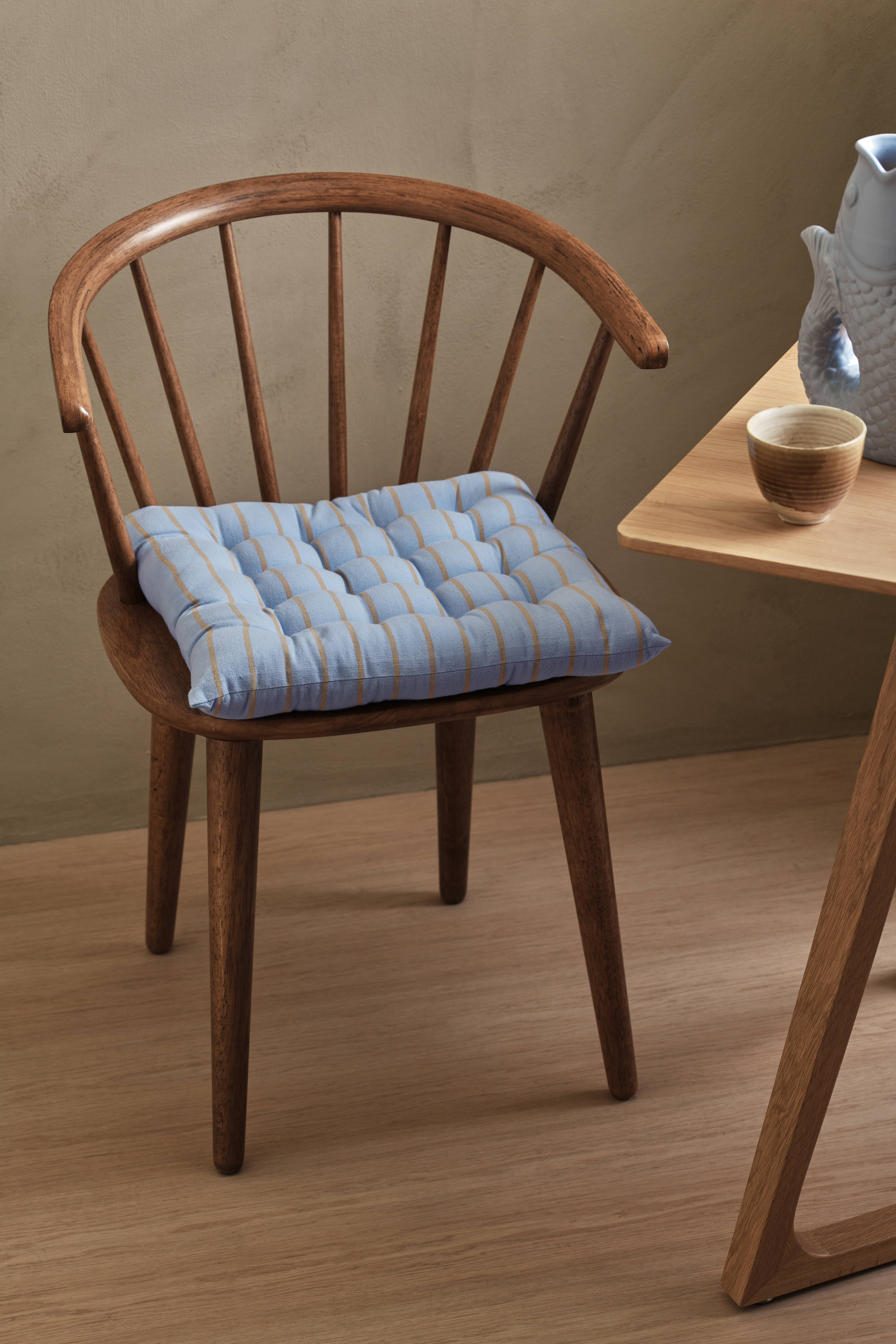 Istuintyyny, joka sopii täydellisesti sekä keittiön tuoliin että ulkokalusteeseen. Puuvillakangas, jossa koristeellisesti sijoitetut pistot. Lankavärjätty. Täyte polyesteriä. Korkeus n. 5 cm.