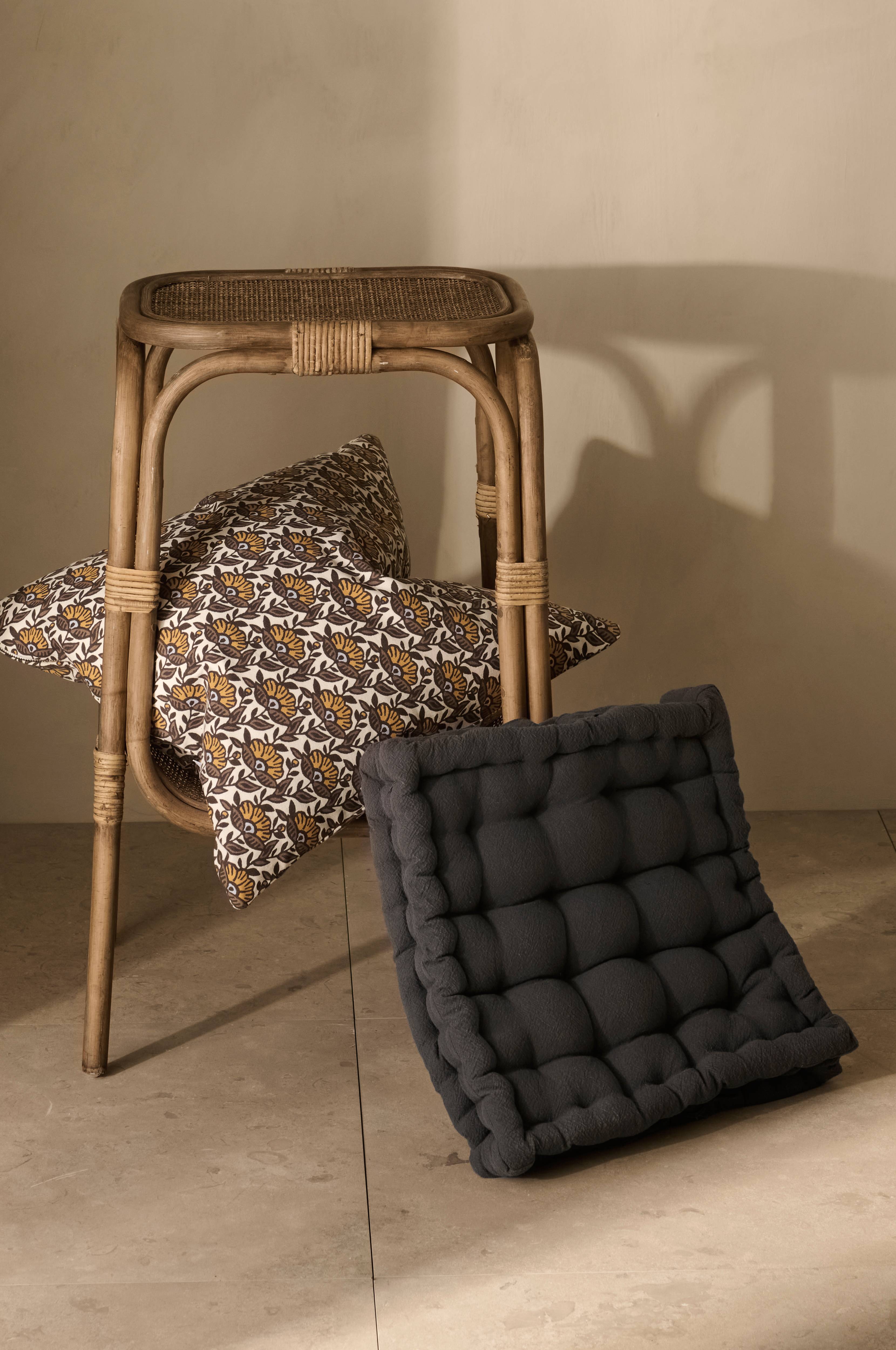 Istuintyyny, jossa laatikkomainen malli. Päällinen puuvillaa, jossa pesty look. Koristeelliset, käsintehdyt ompeleet. Kahva toisella sivulla. Täyte kierrätettyä polyesteriä. Koko 40x40 cm. Paksuus 5 cm.