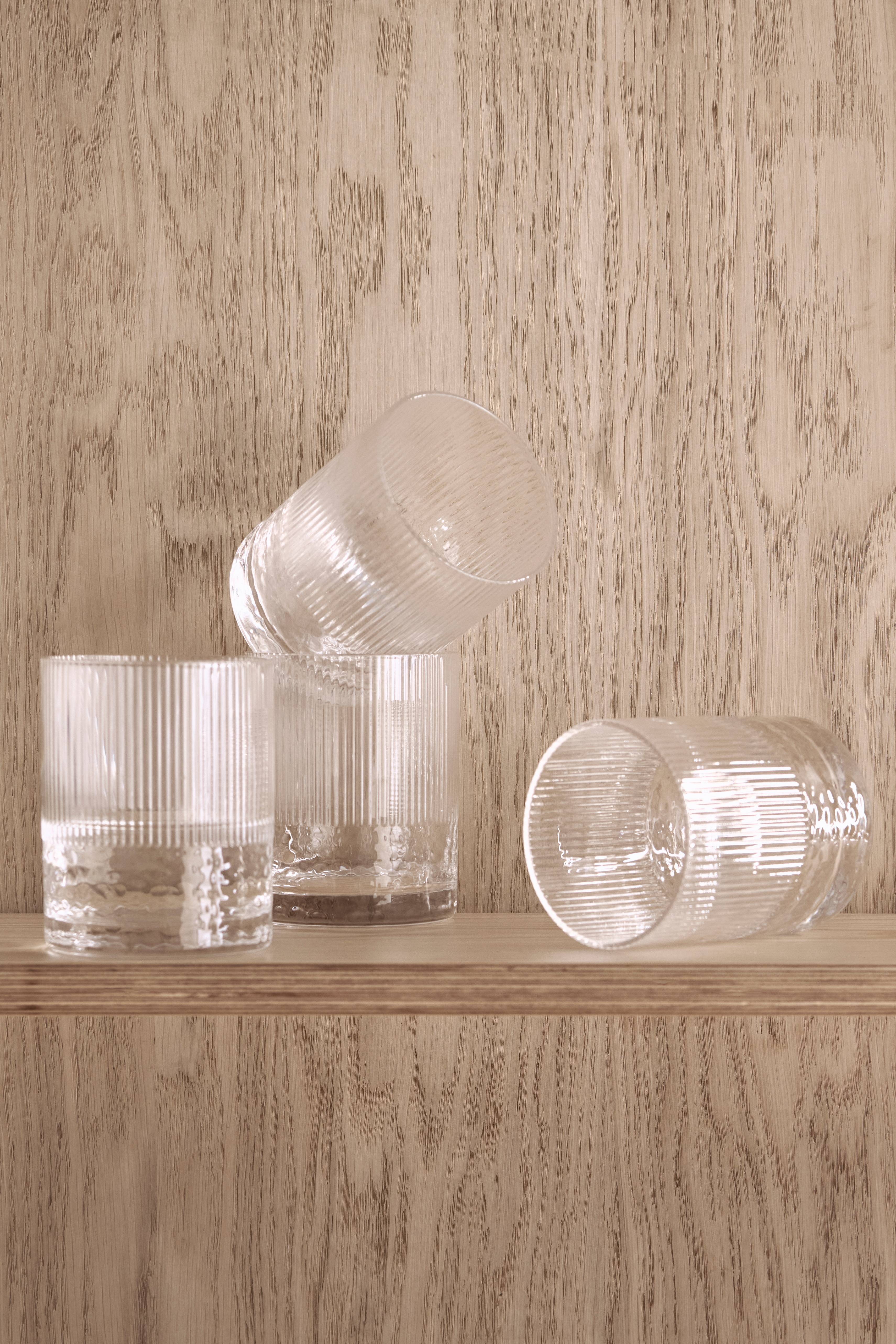 Juomalasit, joissa uurrettu pinta ylhäällä ja koristeellinen pintakuvio alhaalla. Vetoisuus: 360 ml.