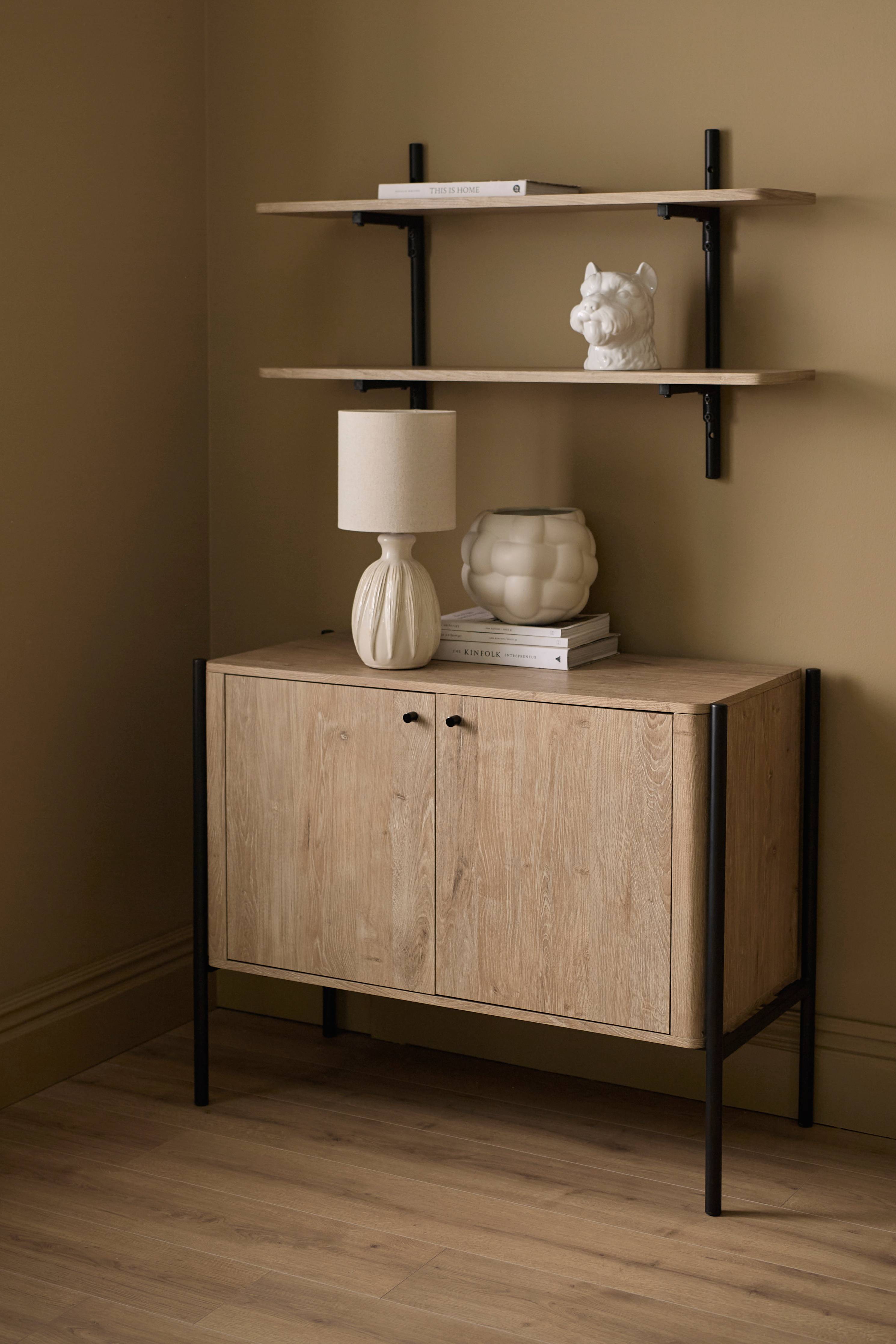 • Pieni kaappi folioidusta MDF-levystä • Jalka jauhelakatusta metallista • Yksi avoin kaappi yhdellä kiinnitetyllä hyllyllä • Yksi kaappi ovella ja kahdella kiinnitetyllä hyllyllä • Hyllyjen välinen etäisyys: 25 cm • Hyllyjen välinen etäisyys: 17/10/18 cm • Vapaa korkeus huonekalujen alla: 27 cm • Kaapin enimmäispainokuormitus 40 kg • Tuote sisältää FSC-sertifioitua puuta, joka on hakattu kestävästi ja vastuullisesti hoidetusta metsästä ja jonka tuotannossa on huomioitu sekä ihmiset että ympäristö.