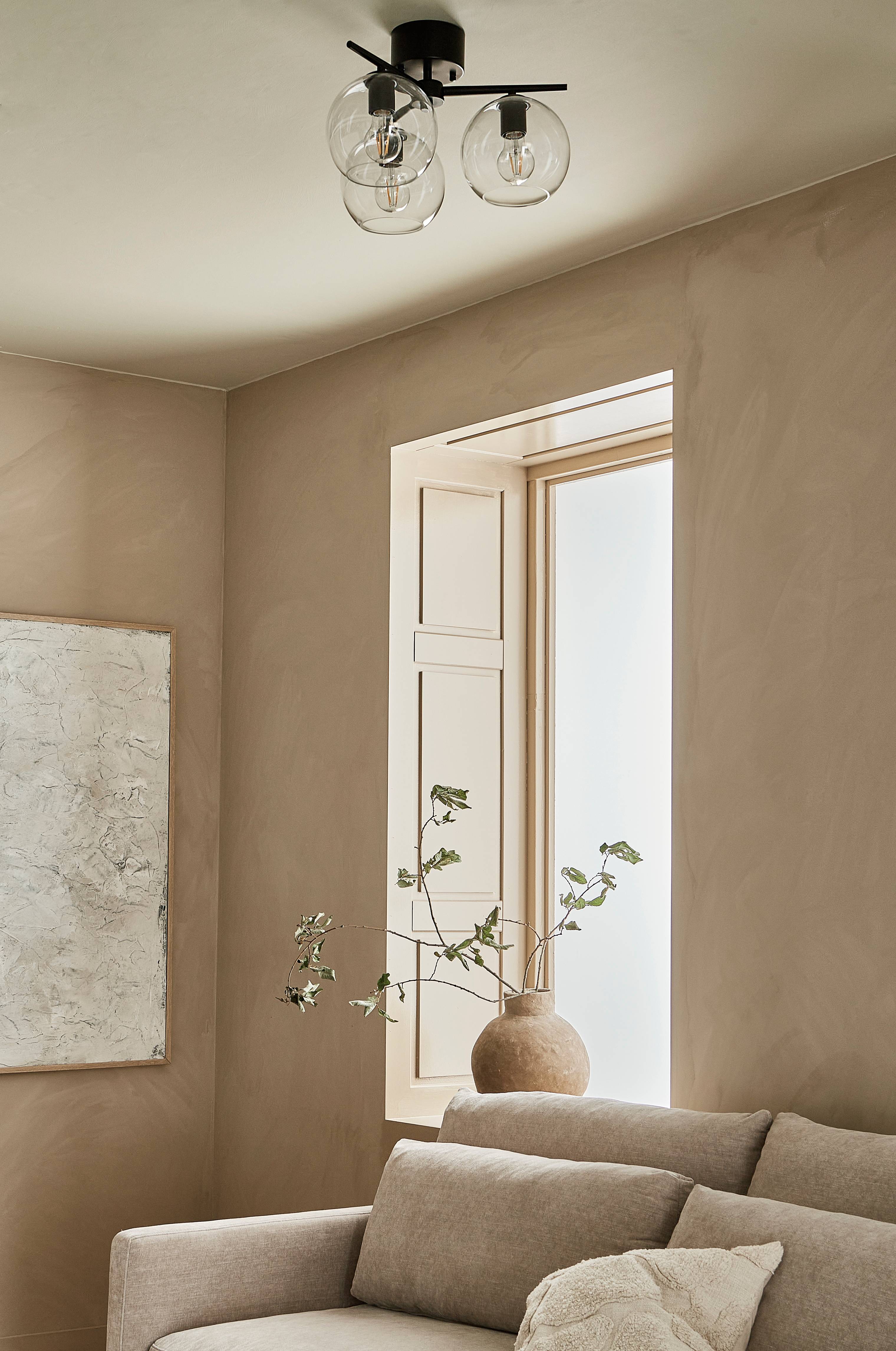 Metallinen kattovalaisin/plafondi, jossa läpinäkyvät lasikuvut. Kolme vartta, joissa kapenevat päät, ja kuvuissa aukko alhaalla. Kokonaiskorkeus 28 cm, kokonaishalkaisija 45 cm. Kuvun halkaisija 18 cm. Kattokuppi ja ripustin. Korkeus 6 x halkaisija 12 cm. Lampunkanta 3xE27. Enintään 40 W. Valonlähteet eivät sisälly toimitukseen.