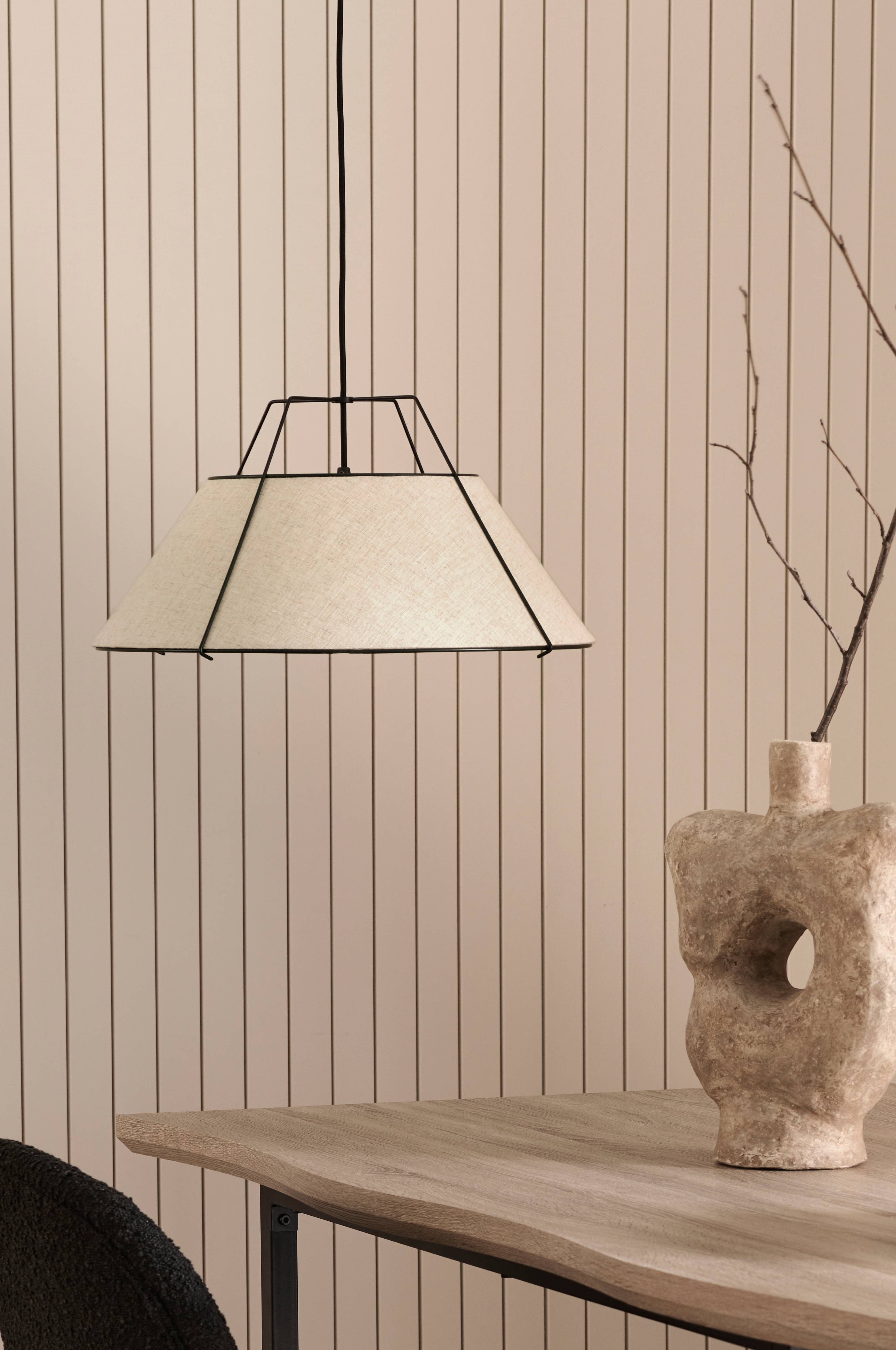 Tyylikäs kattovalaisin, jossa musta metallikehys ja pellavavarjostin.
