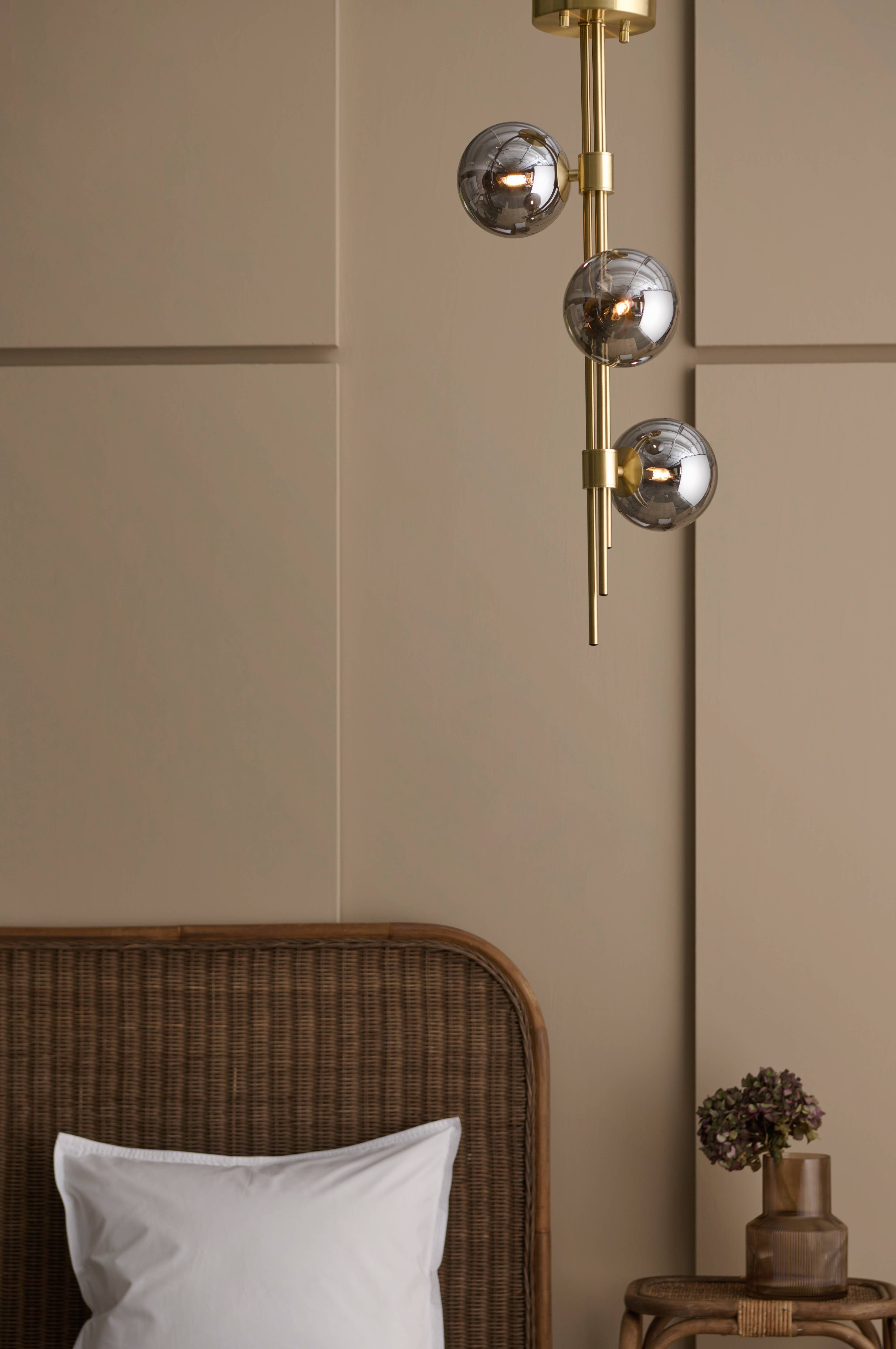 Kattovalaisimessa on 3 kiinteää messinginväristä harjattua metalliputkea, joissa on kussakin savunvärinen, peilitehosteella varustettu lasikupu. Lasikuvut kiinnitetään lampunpidikkeisiin kierretoiminnon avulla. Kokonaispituus katosta 70 cm (kiinteä pituus, ei säädettävissä). Lasikupujen koko: Ø 12 cm. Lampunkanta 3 x G9. Enintään 5 W. Kattokuppi messinginväristä harjattua metallia, korkeus 5,5 cm ja halkaisija 13 cm. Asennetaan kiinnikkeen avulla. Valonlähteet eivät sisälly toimitukseen.