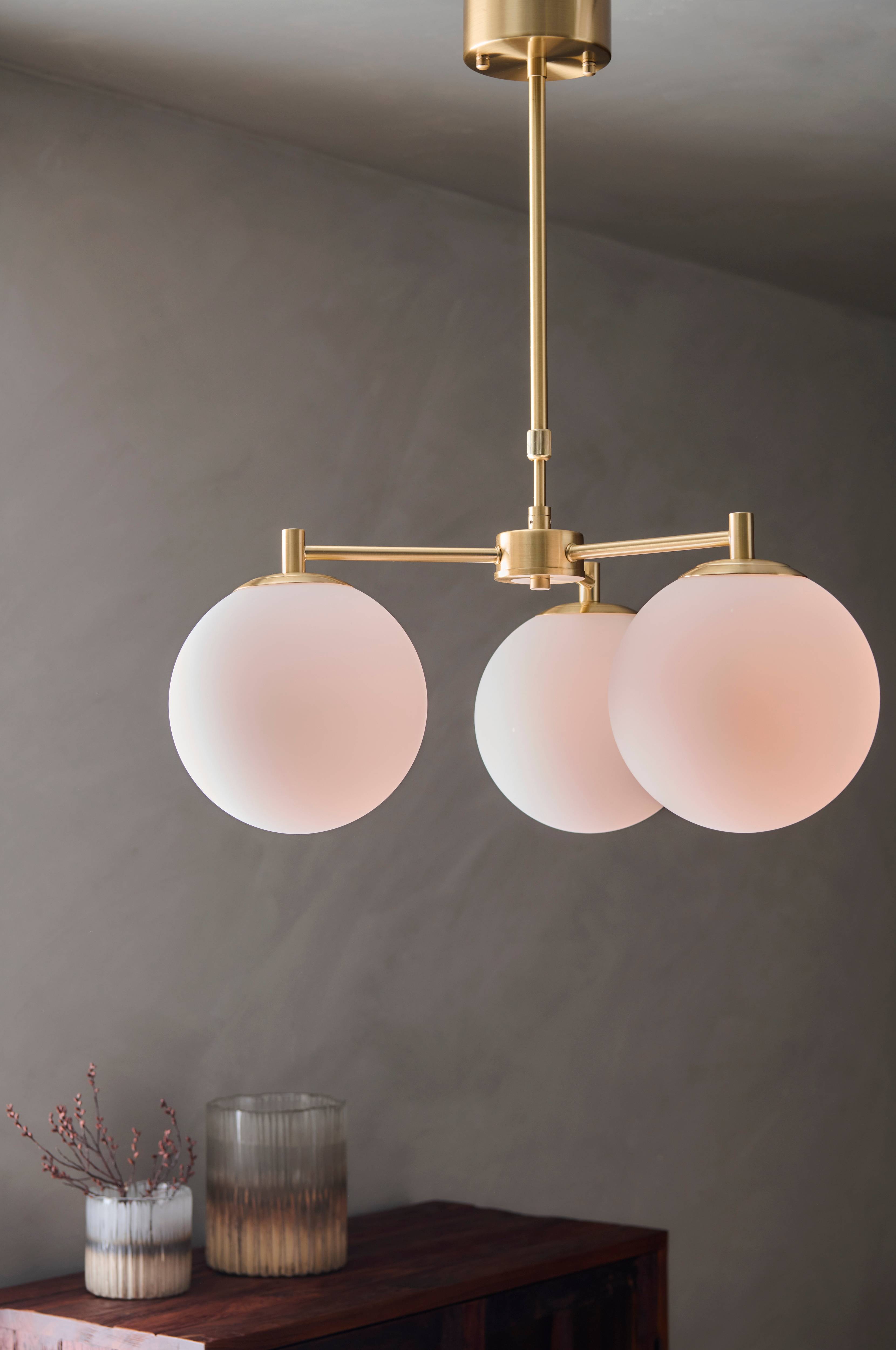 Elegantti kattovalaisin metallia. Valkoiset mattapintaiset opaalilasikuvut. Kolme vartta, joissa kussakin kupu. Kuvut kiinnitetään/irrotetaan ruuvilla. Halkaisija 20 cm. Kokonaishalkaisija alhaalta 60 cm. Metalliputken korkeutta voi säätää, valaisimen enimmäiskorkeus on 92 cm ja vähimmäiskorkeus 62 cm. Iso lampunkanta 3xE27. Enintään 40 W. Kattokupu ja ripustuskoukku, K 6 x halkaisija 12 cm.