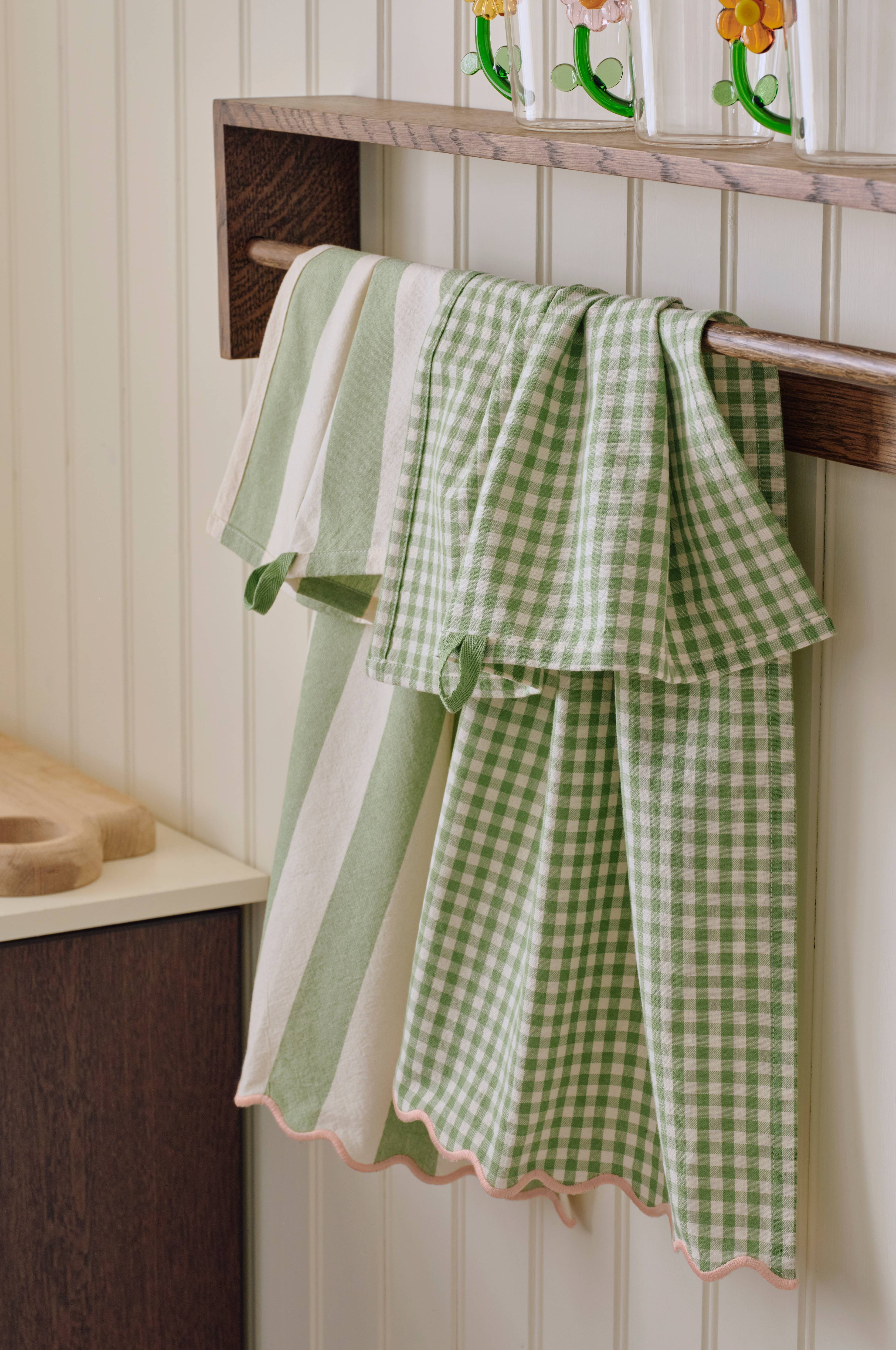 • Kaksi astiapyyhettä puuvillasta pehmeällä, pestyllä huolittelulla• Aaltoileva, kontrastivärinen sauma lyhyitä sivuja pitkin• Yksi pyyhe lankavärjätyllä ruutukuviolla• Yksi pyyhe lankavärjätyillä raidoilla