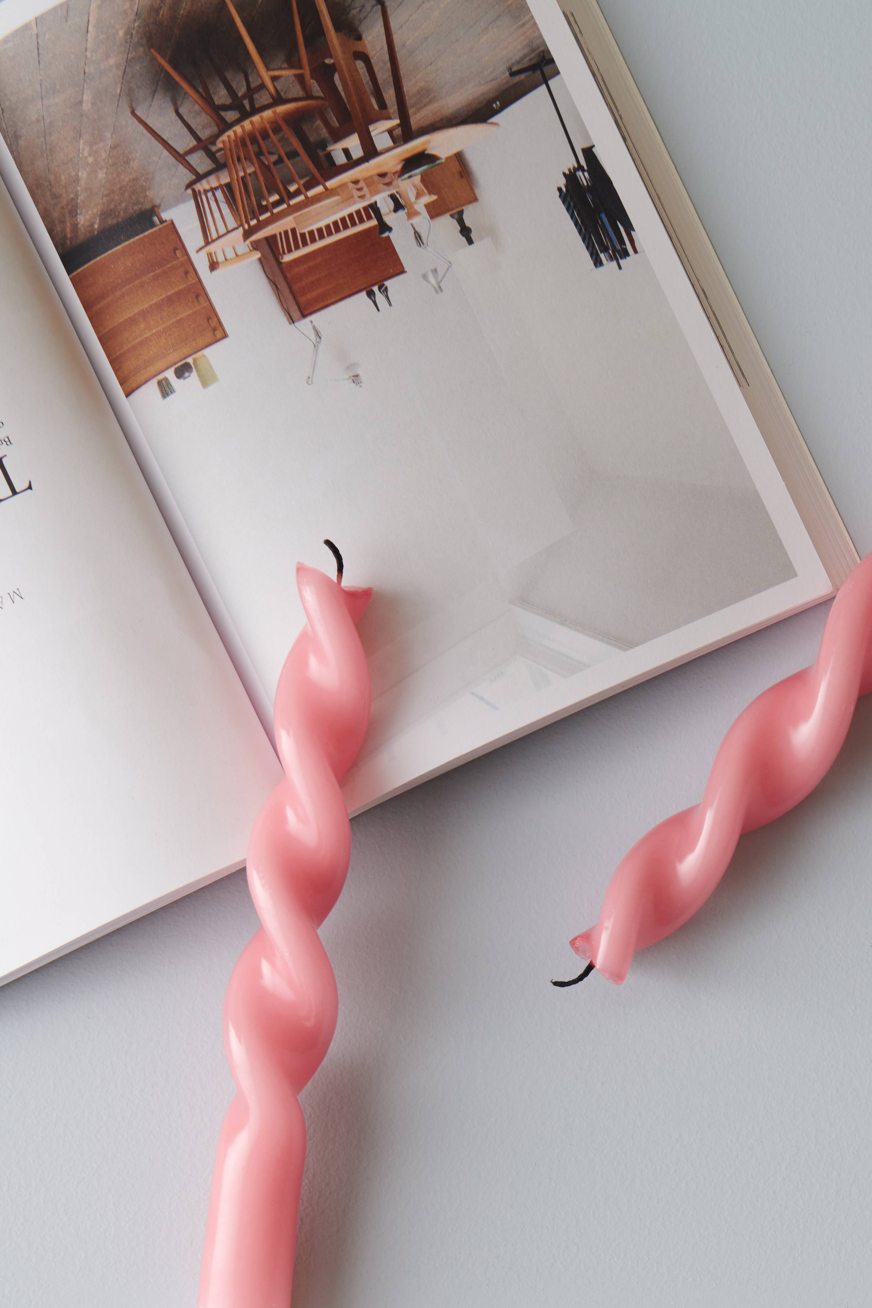 Kierretyt, litteät kynttilät, 2/pakkaus. Korkeus 29 cm, halkaisija 2,2 cm. Paloaika n. 9 tuntia. Kynttilät ovat 100% parafiinia. Parafiinia käytetään steariinin sijaan, koska se on pehmeämpi materiaali, jolloin kynttilän voi muotoilla ja kiertää. Tämä ei onnistu steariinilla, joka on liian kovaa kierrettäväksi.