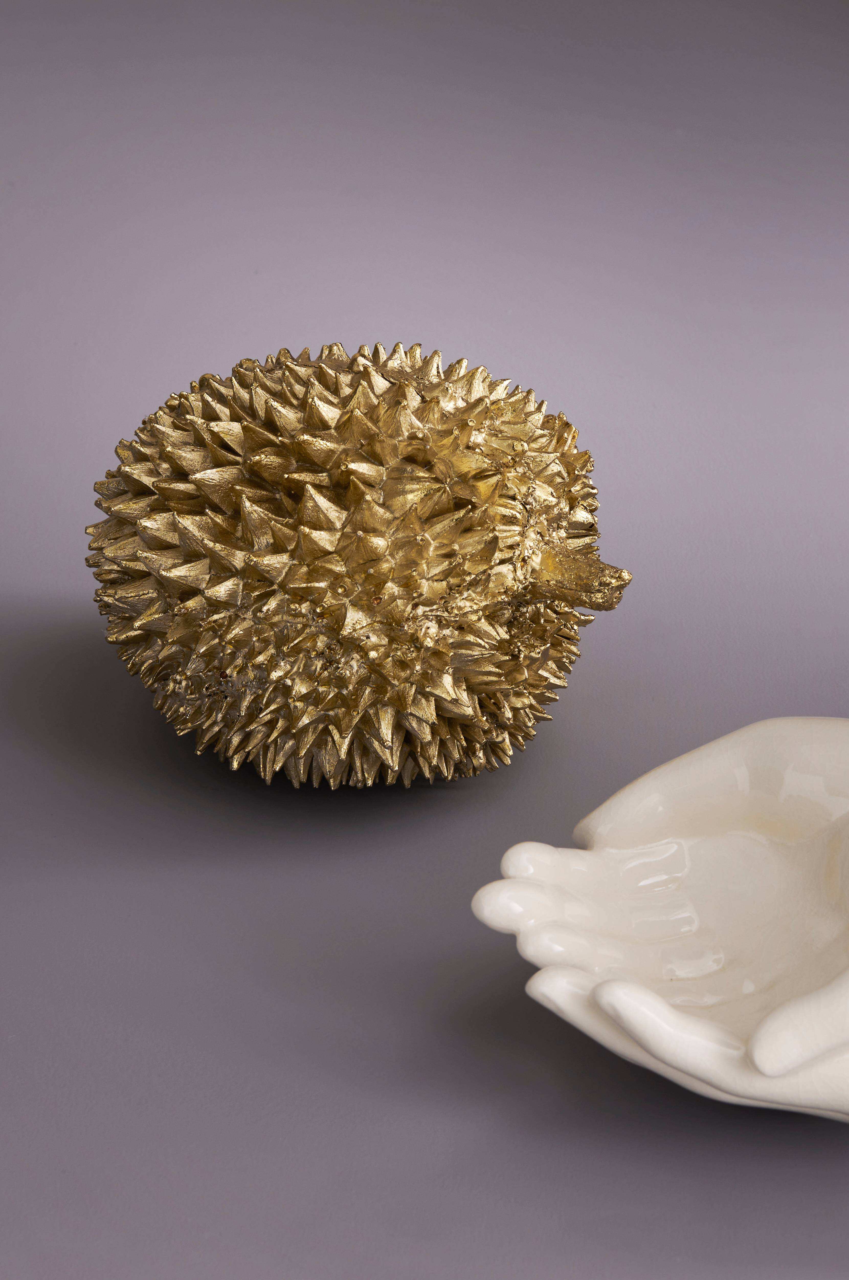Koriste polyresiiniä, kullanvärinen viimeistely. Korkeus 15 cm, leveys 19 cm, syvyys 14 cm.