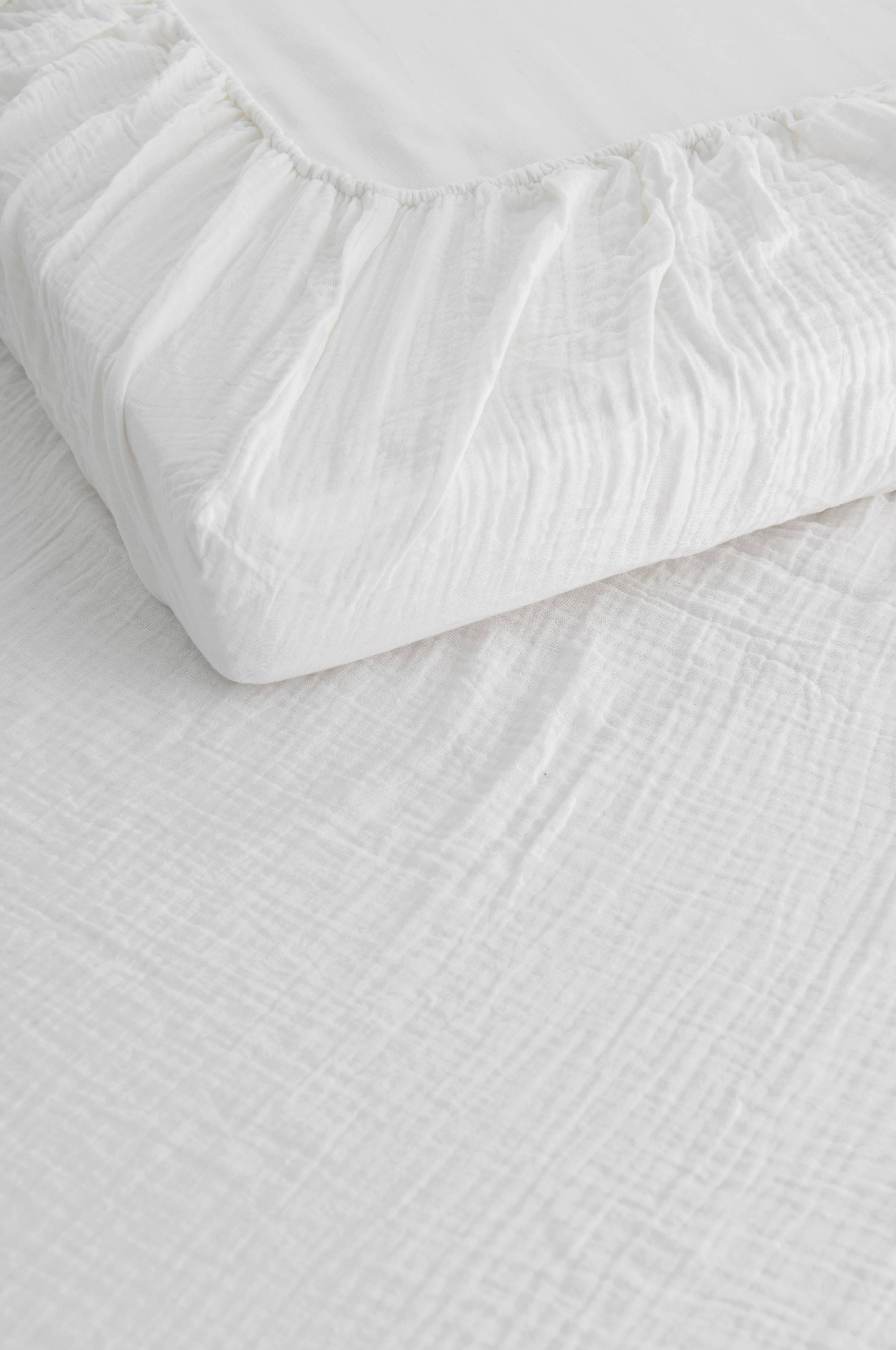 Kuminauhalakana kaksinkertaista pestyä ekologista puuvillamusliinia. Kuminauha kaikissa reunoissa. Taite 25 cm. Sopii enintään 10 cm:n paksuisiin patjoihin. Langantiheys: 230 TC.