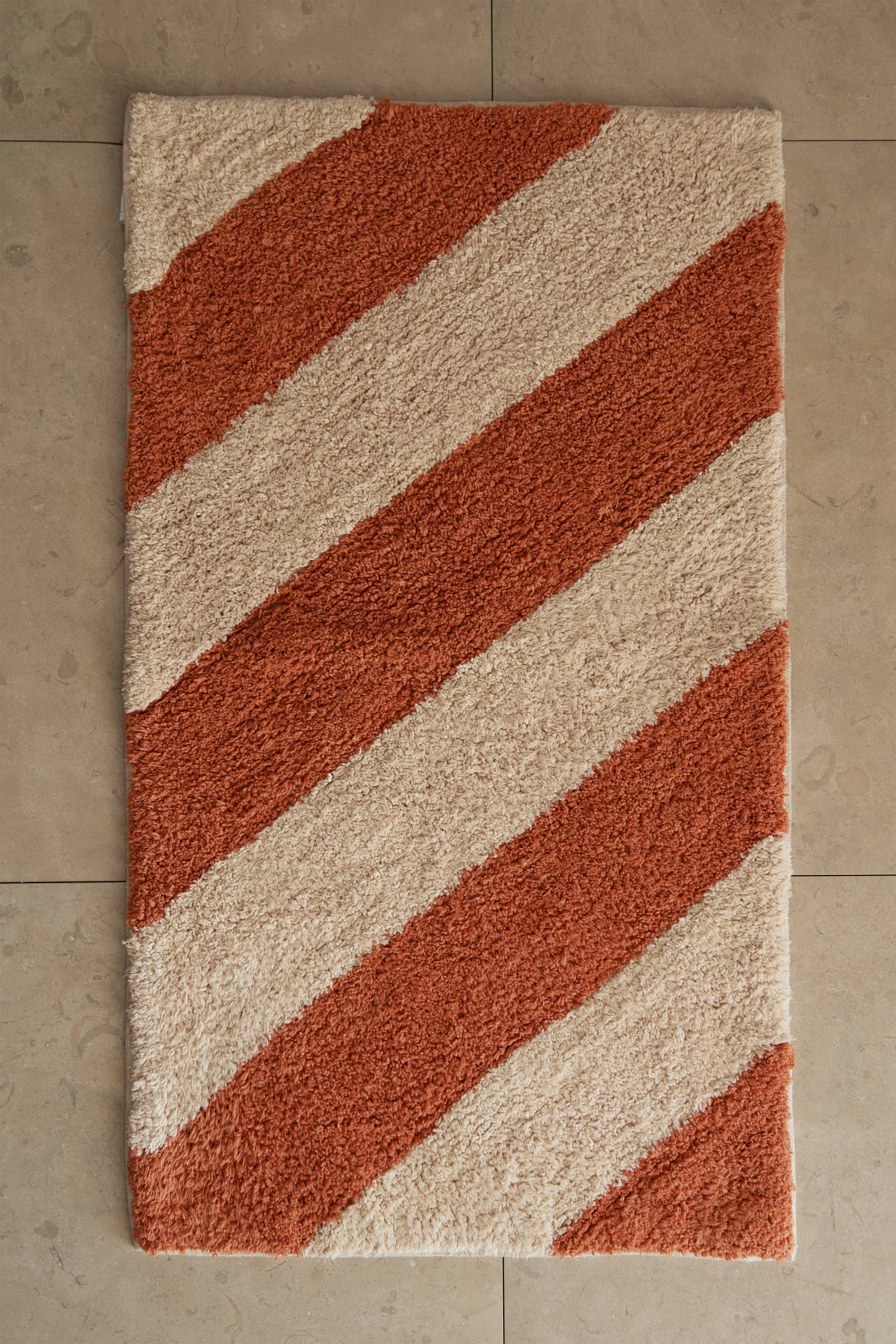 • Kylpyhuoneen matto tupsukoristeisesta puuvillasta diagonaalisilla raidoilla