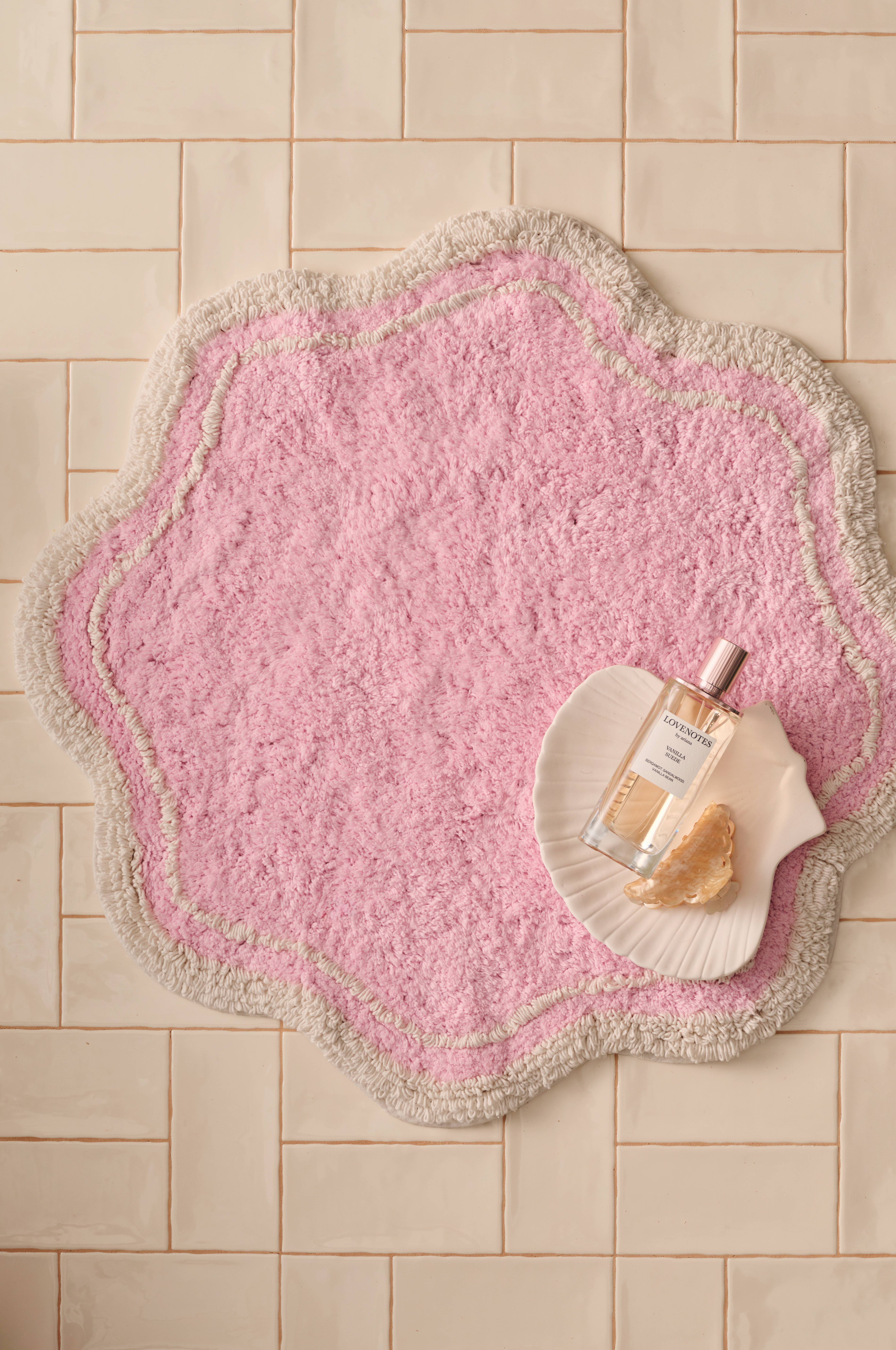 • Tupsukoristeinen kylpyhuoneen matto kontrastivärisellä reunalla