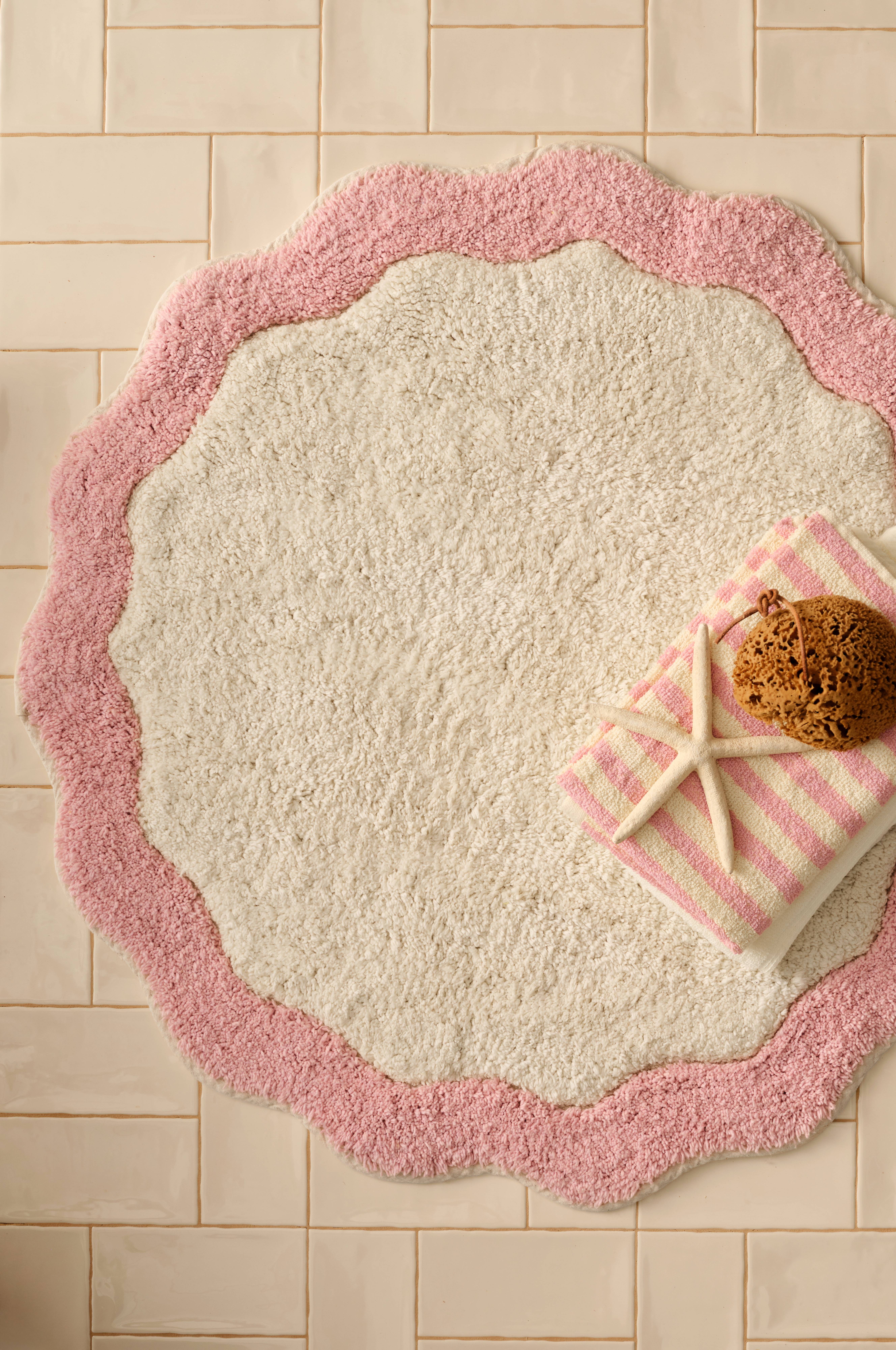 • Tupsukoristeinen kylpyhuoneen matto puuvillasta• Aaltoilevat, kontrastiväriset reunat