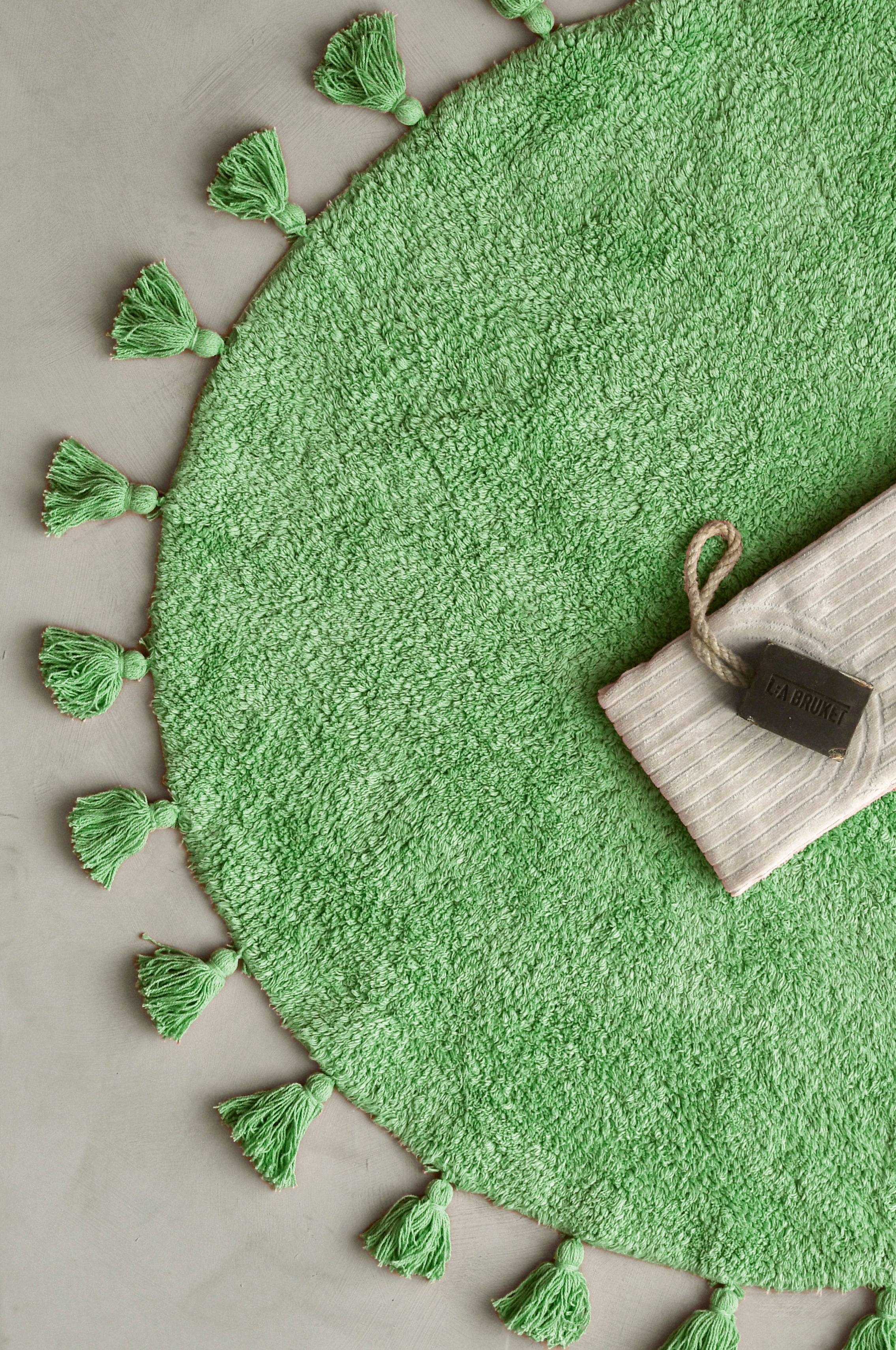 Pyöreä, tuftattu kylpyhuonematto puuvillaa. Tupsut ympäriinsä.