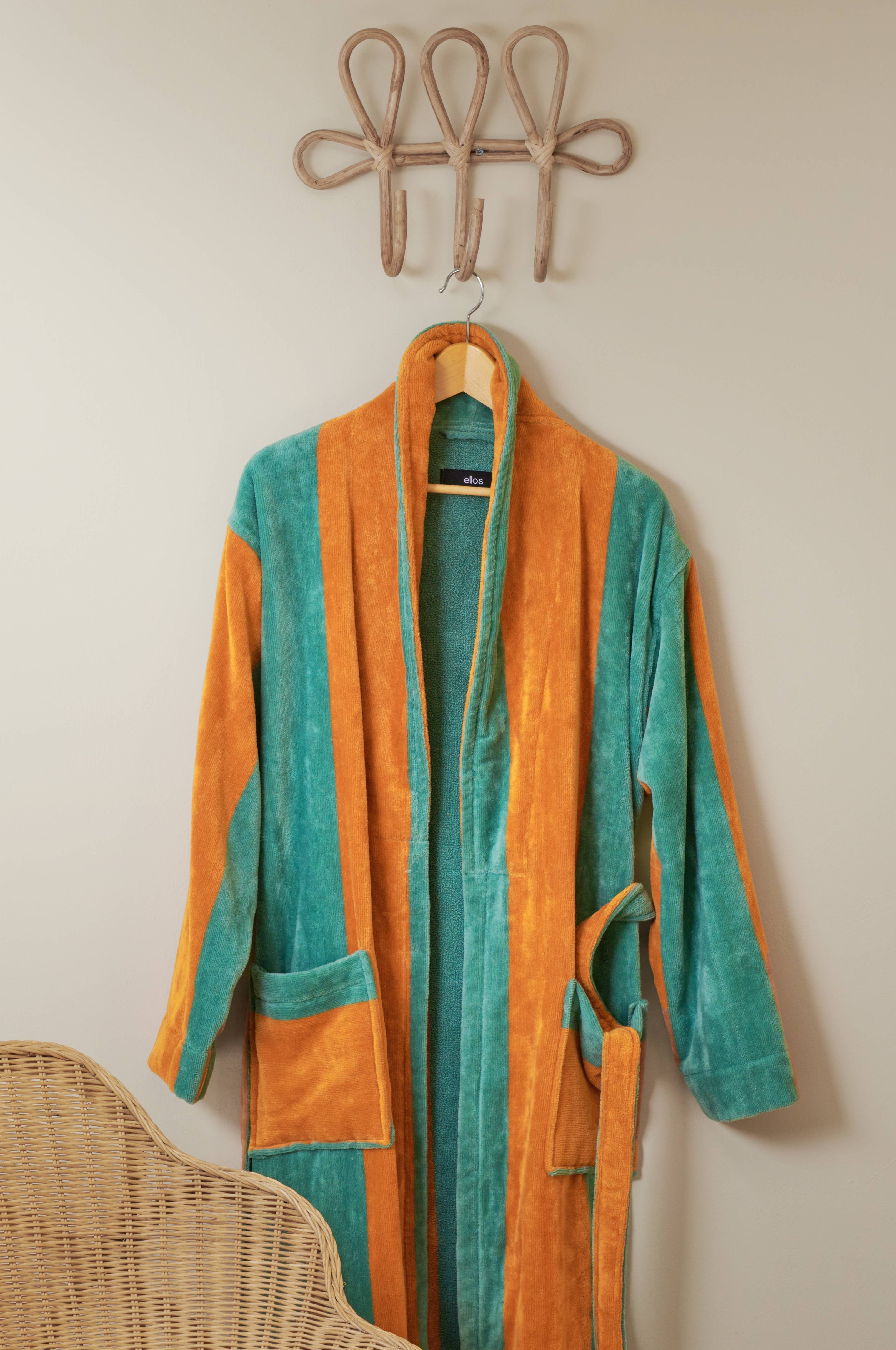 Kylpytakki pehmeää puuvillaveluuria. Kaksi taskua ja irrotettava solmimisvyö vyötäröllä.