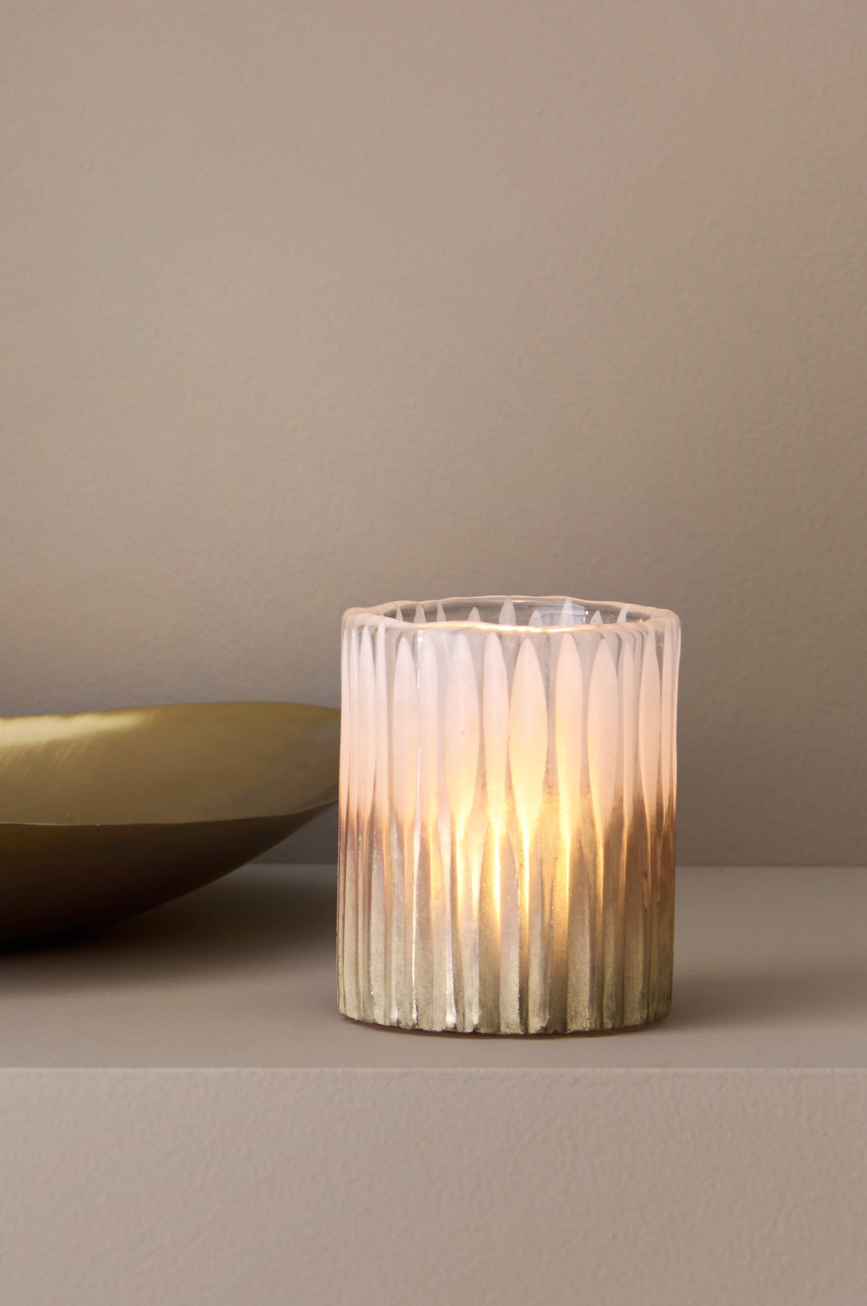 Käsintehty kynttilälyhty lasia, jossa huurrettu struktuuripinta. Korkeus 10 cm, halkaisija 8 cm.Käsintehdyissä tuotteissa voi esiintyä pieniä sävy-, pinta- ja kokovaihteluita.