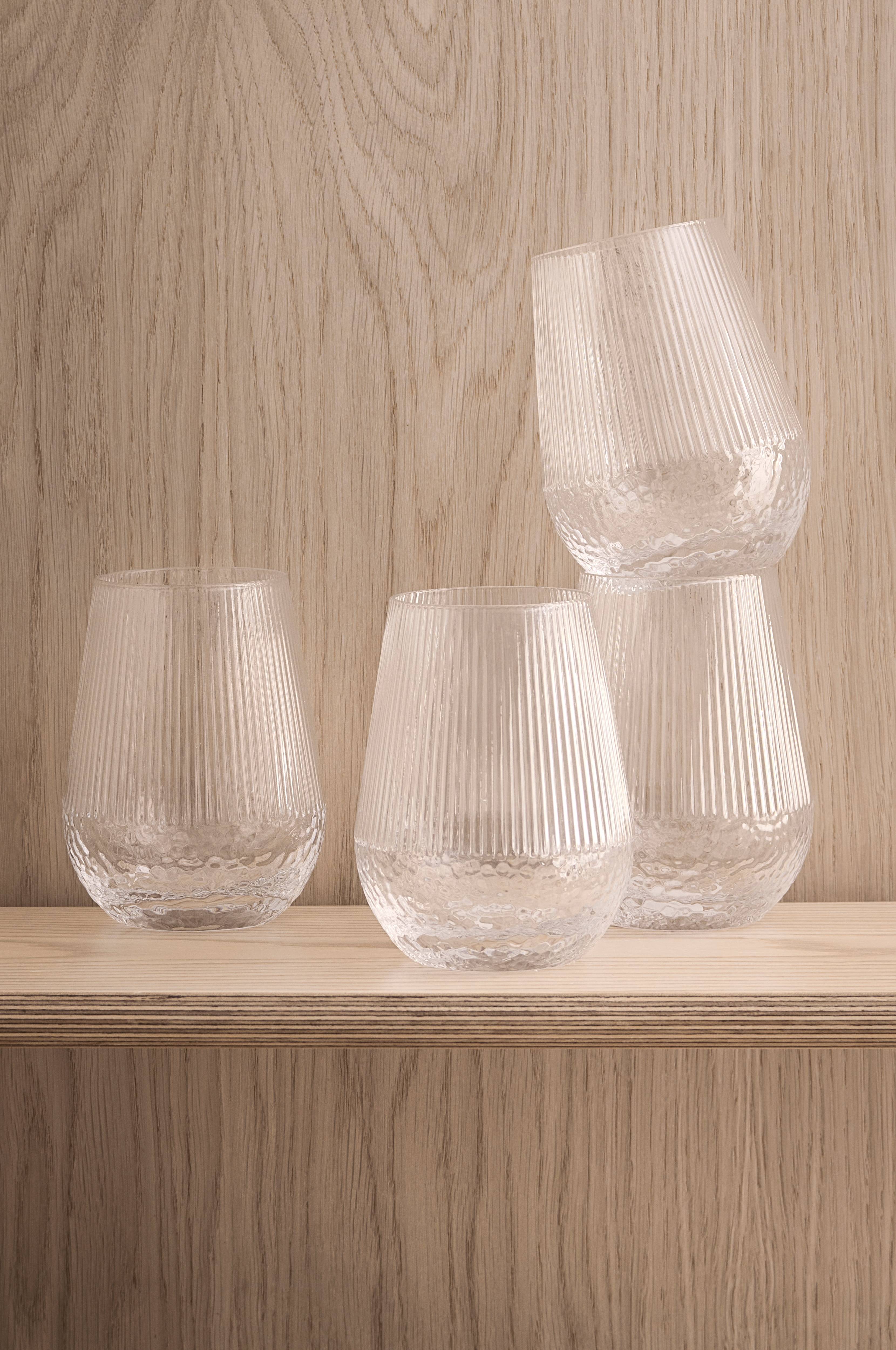 Lasit, 4 kpl. Korkeus 12 cm. Halkaisija ylhäältä 6,5 cm. Halkaisija suurimmillaan 8,5 cm. Vetoisuus: 480 ml. Kestävät konepesun, mutta eivät mikroaaltouunia.