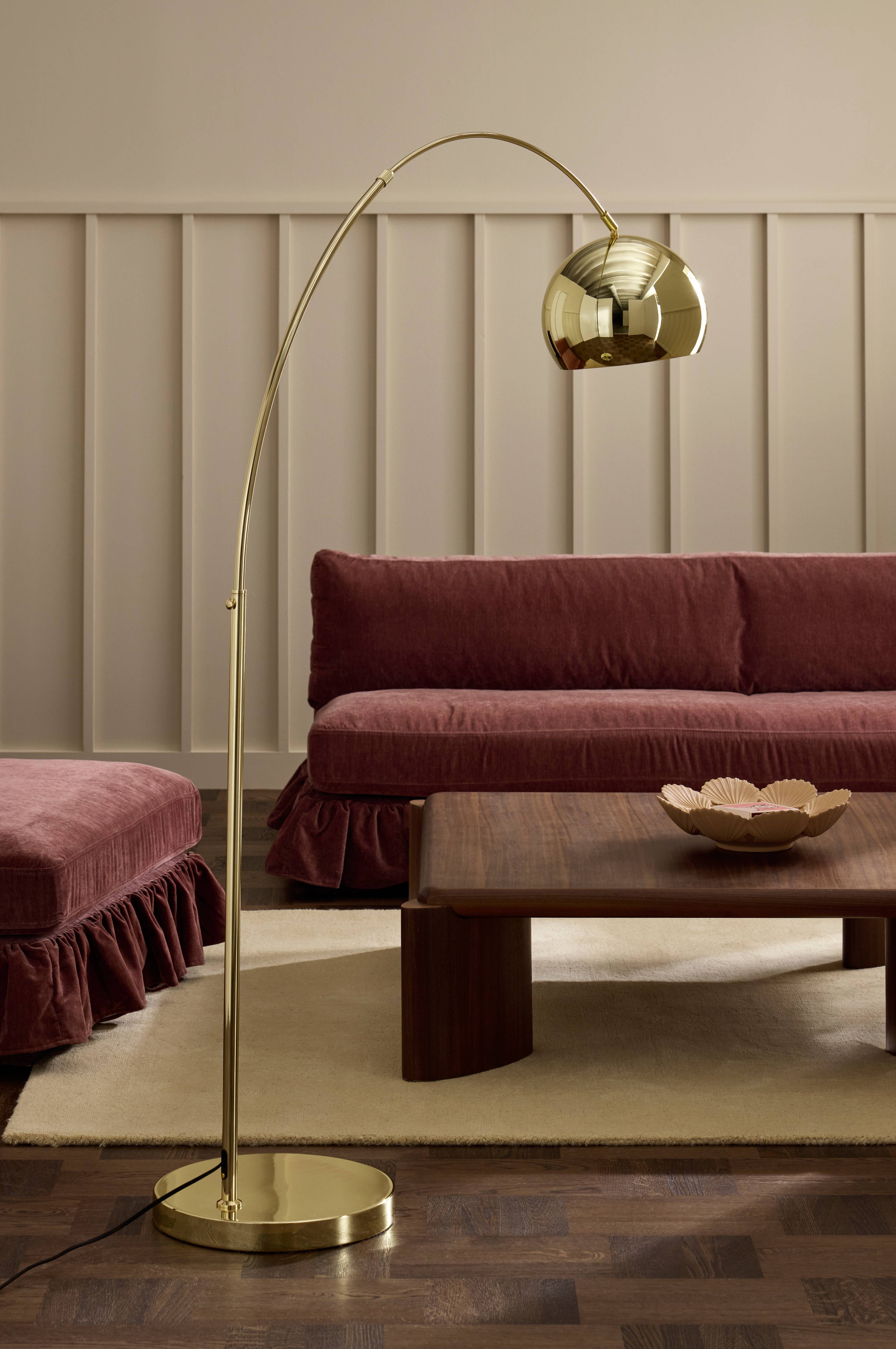 Metallinen lattiavalaisin, jossa kiiltävä viimeistely. Ylempi varsi voidaan säätää halutun pituiseksi, ja varjostinta voidaan säätää korkeussuunnassa. Valaisimen mitat: Enimmäiskorkeus 160 cm ja syvyys n. 65-115 cm. Varjostimen mitat: Halkaisija 27 cm, korkeus 20,5 cm. Pohjalevyn mitat: Halkaisija 35 cm, korkeus 4 cm. Musta kangasjohto, jossa lattiakatkaisin ja seinäpistoke. Johdon pituus 250 cm. Lampunkanta E27. Enintään 25 W. Valonlähde ei sisälly toimitukseen.