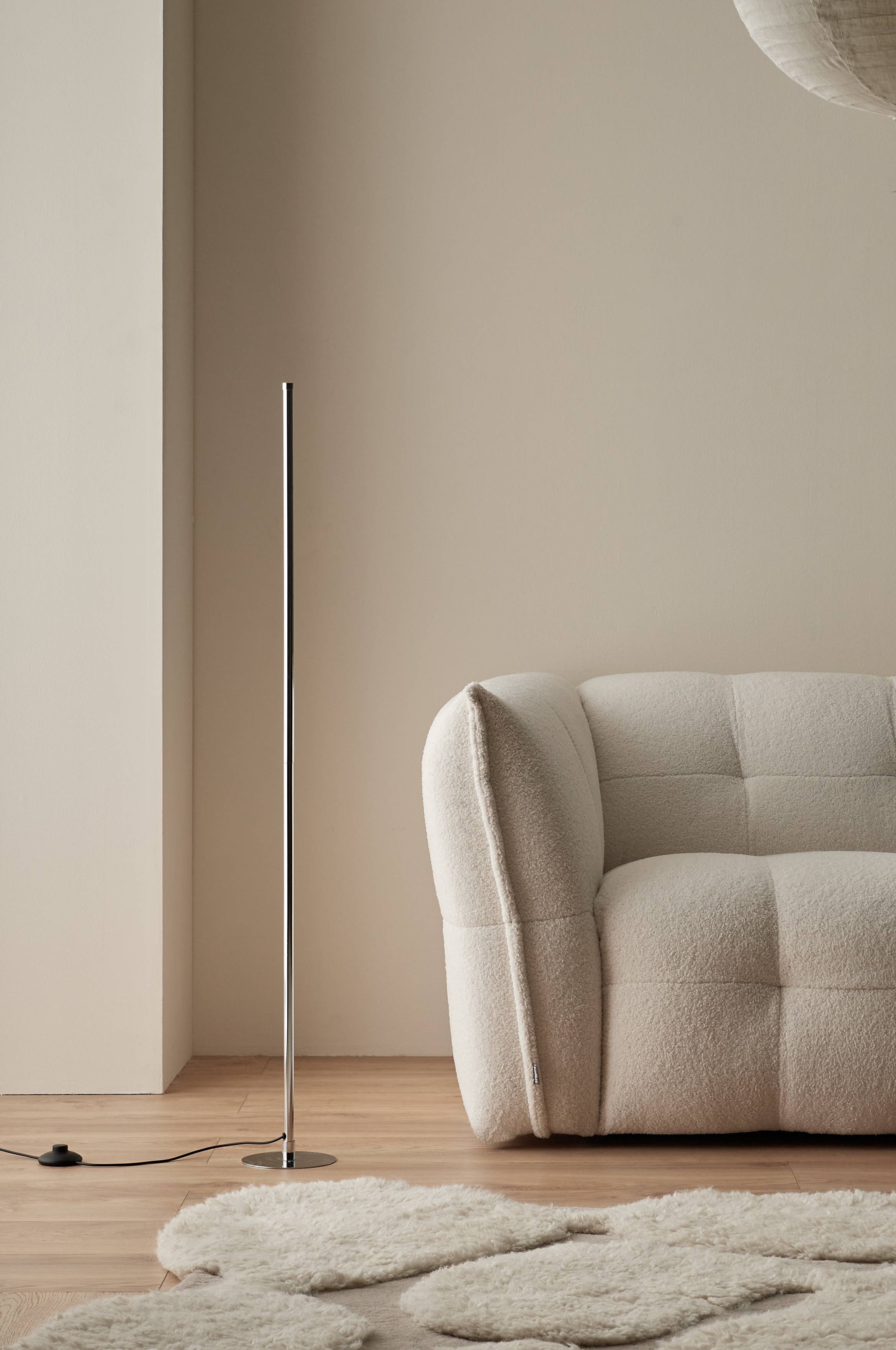 Metallinen lattiavalaisin, jossa moderni muotoilu ja integroitu LED-valonlähde. Korkeus 125 cm, josta silikonisen LED-valonhajottimen osuus n. 60 cm. Muovijohto, jossa virtakatkaisin.