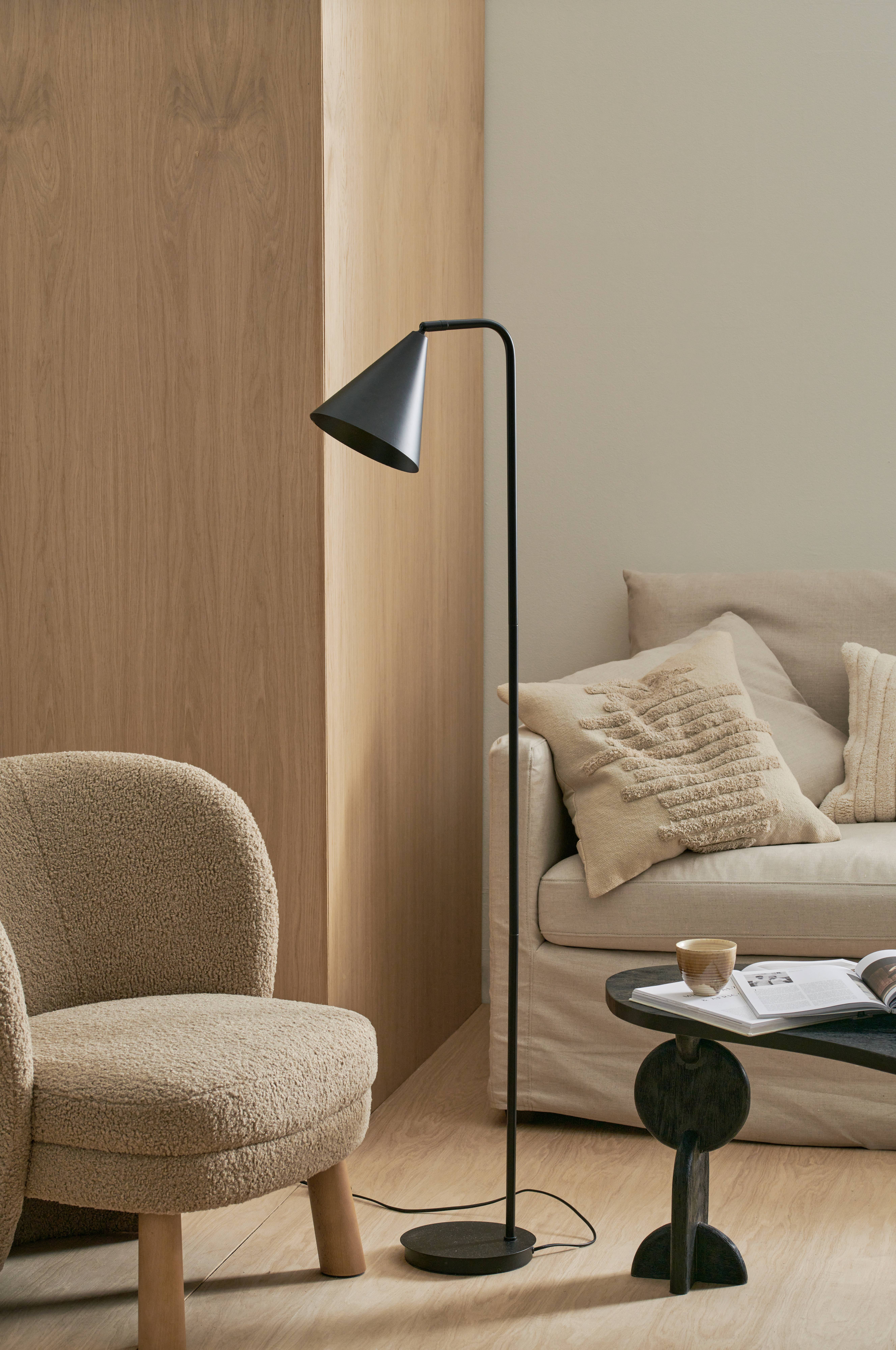 Metallinen lattiavalaisin, jossa trendikäs kartionmuotoinen varjostin. Varjostinta voidaan säätää korkeus- ja sivusuunnassa. Virtakatkaisin johdossa. Varjostimen mitat: Halkaisija 18 cm x korkeus 20 cm. Lampunjalan halkaisija: 20 cm. Valonlähde ei sisälly toimitukseen.