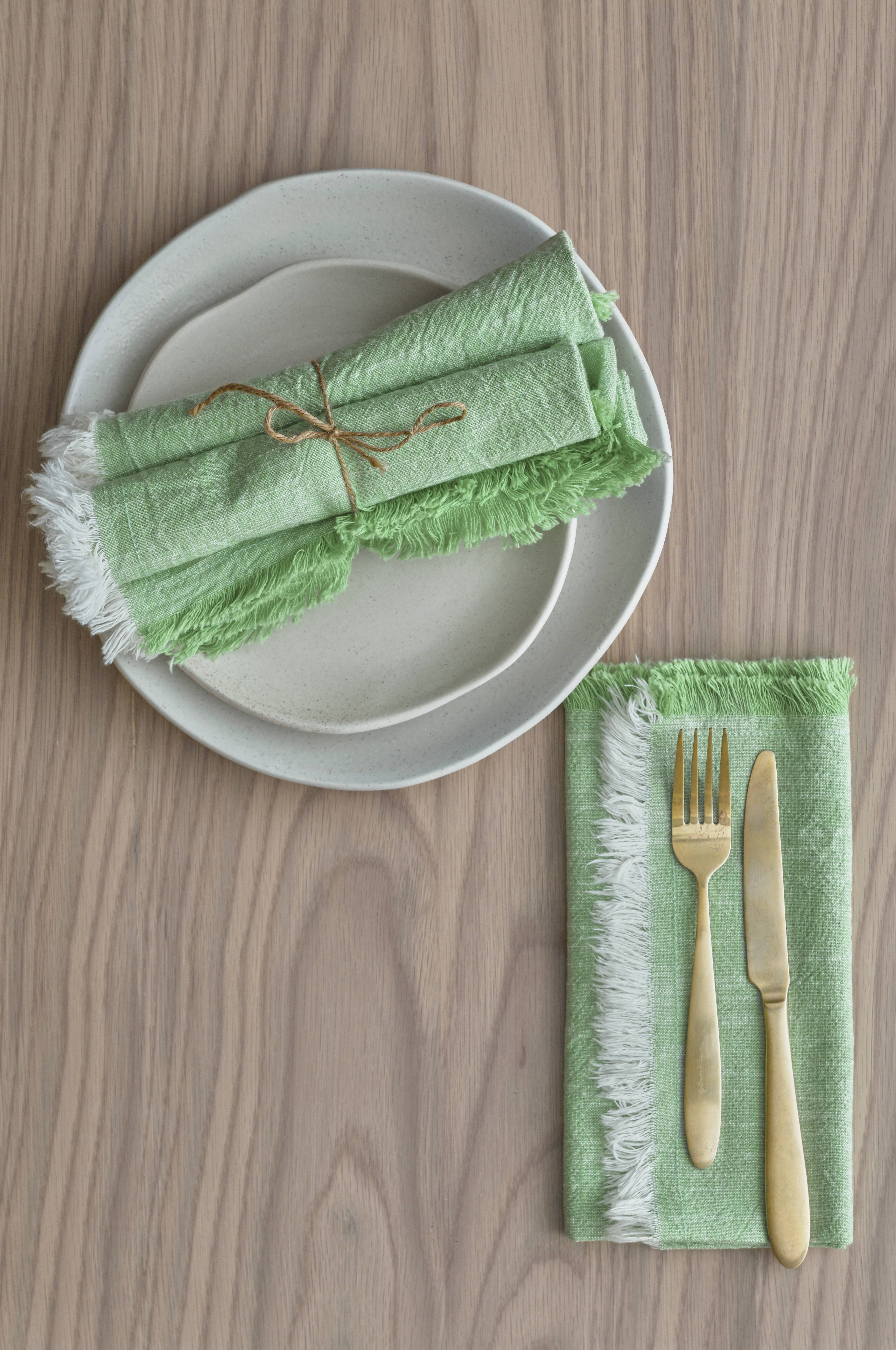 Lautasliinat eläväpintaista ekologista meleeratun väristä puuvillaa, 4/pakkaus. Hapsut neljällä sivulla.
