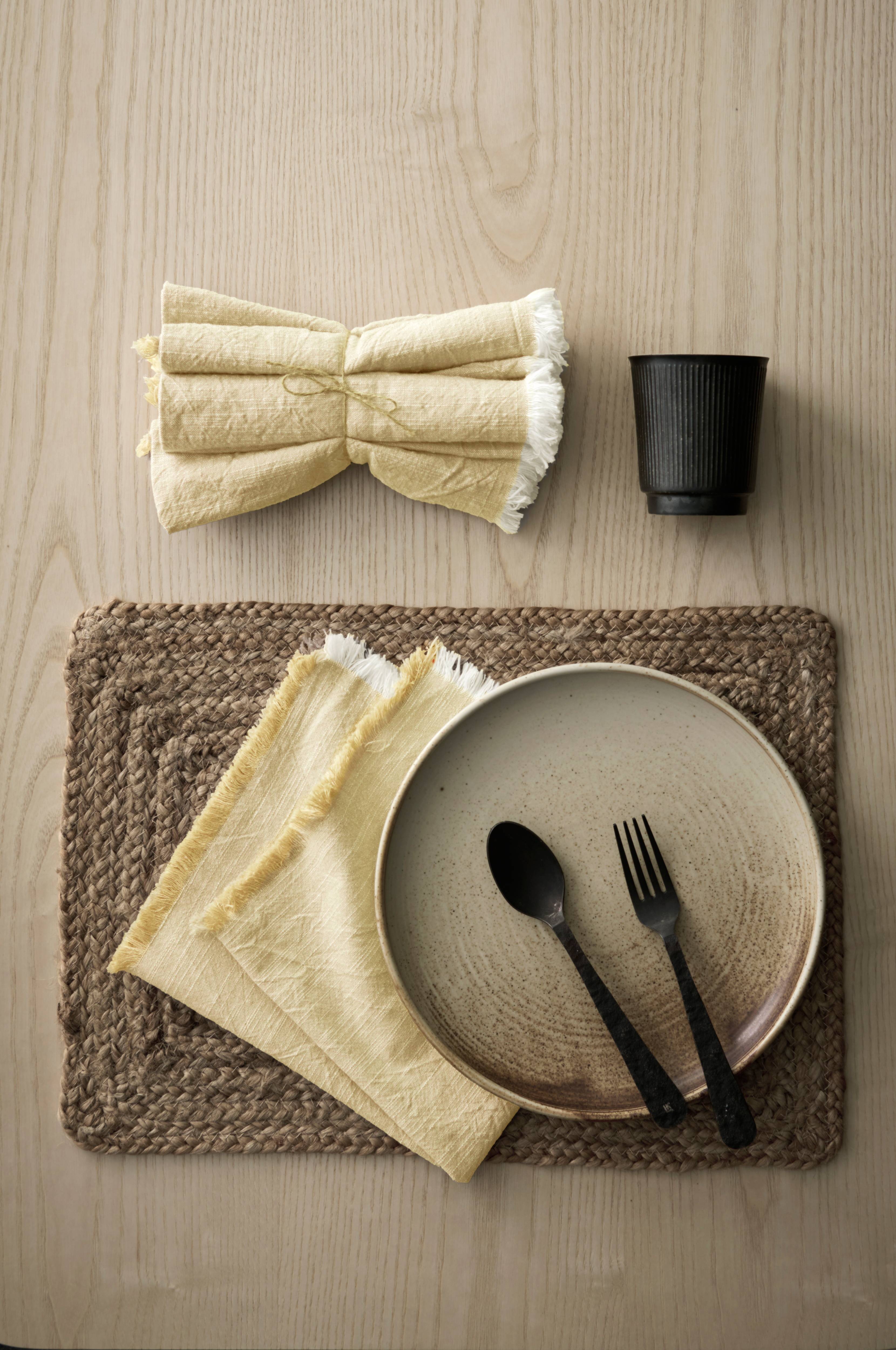 Lautasliinat eläväpintaista ekologista meleeratun väristä puuvillaa, 4/pakkaus. Hapsut neljällä sivulla.