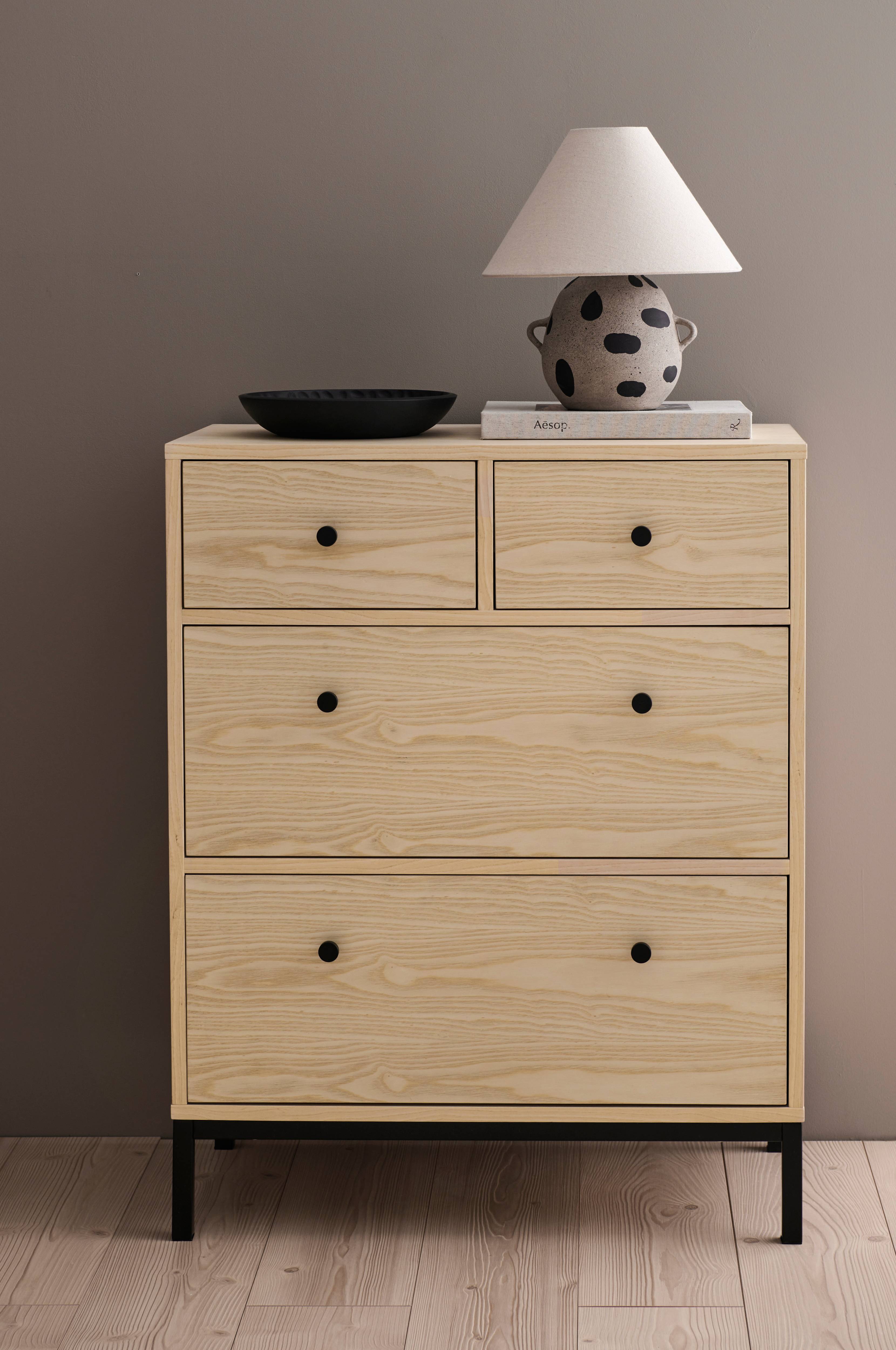 Lipasto maalattua tai saarniviilutettua MDF-levyä. Kaiverrettu kuvio päädyissä ja koristeelliset nupit laatikoissa. 2 isoa ja 2 pientä laatikkoa.