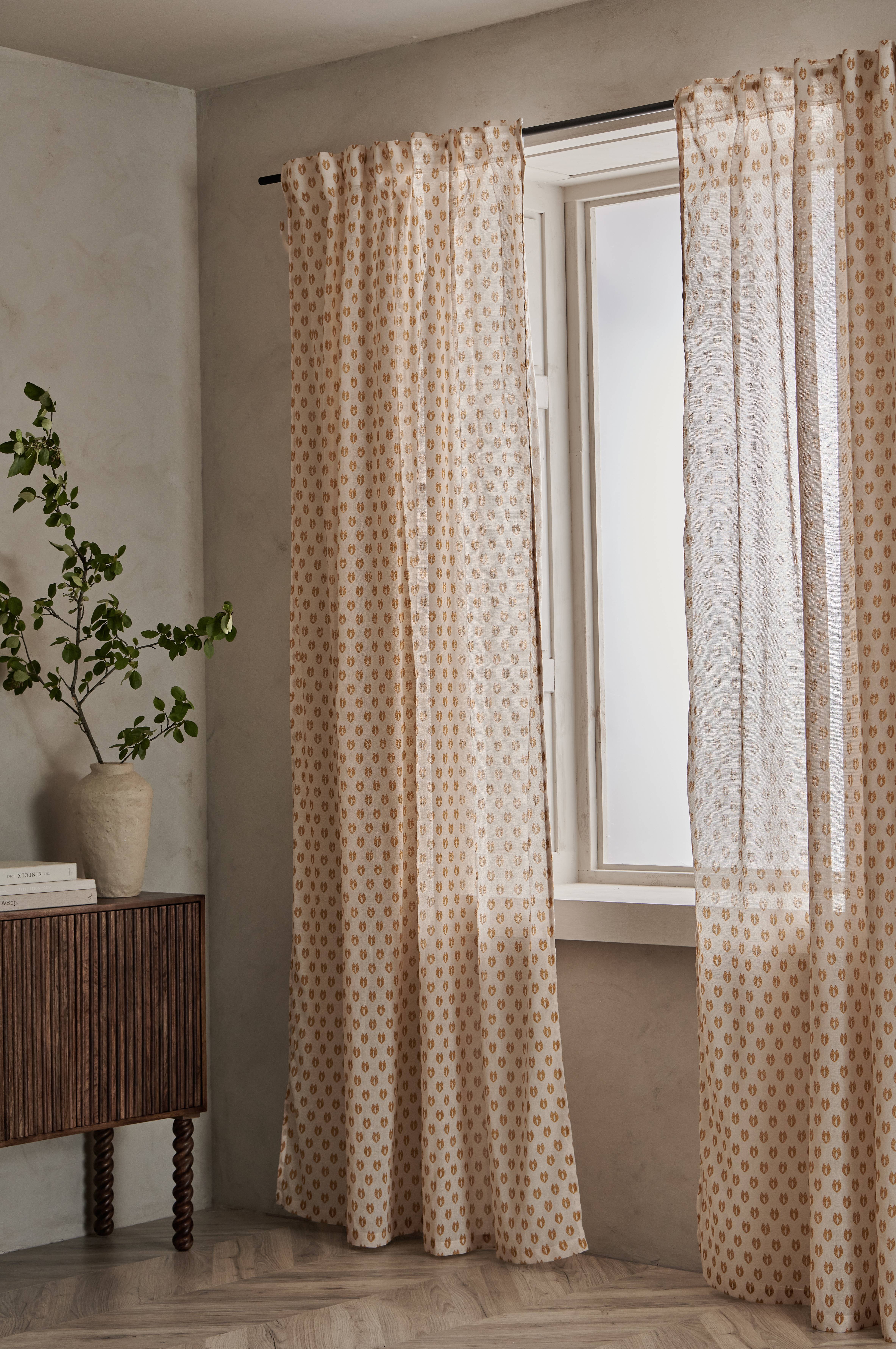 Kaksi monitoimiverhoa pehmeää ja harvaan kudottua puuvillaa, jossa painettu kuvio. Monitoiminauhan ansiosta verhot voidaan ripustaa piilolenkkien avulla suoraan verhotankoon tai käyttää ripustamiseen renkaita, neulakoukkuja tai sormikoukkuja. Poimutusnauhan nyöreillä saat helposti tasaiset ja kauniit laskokset.
