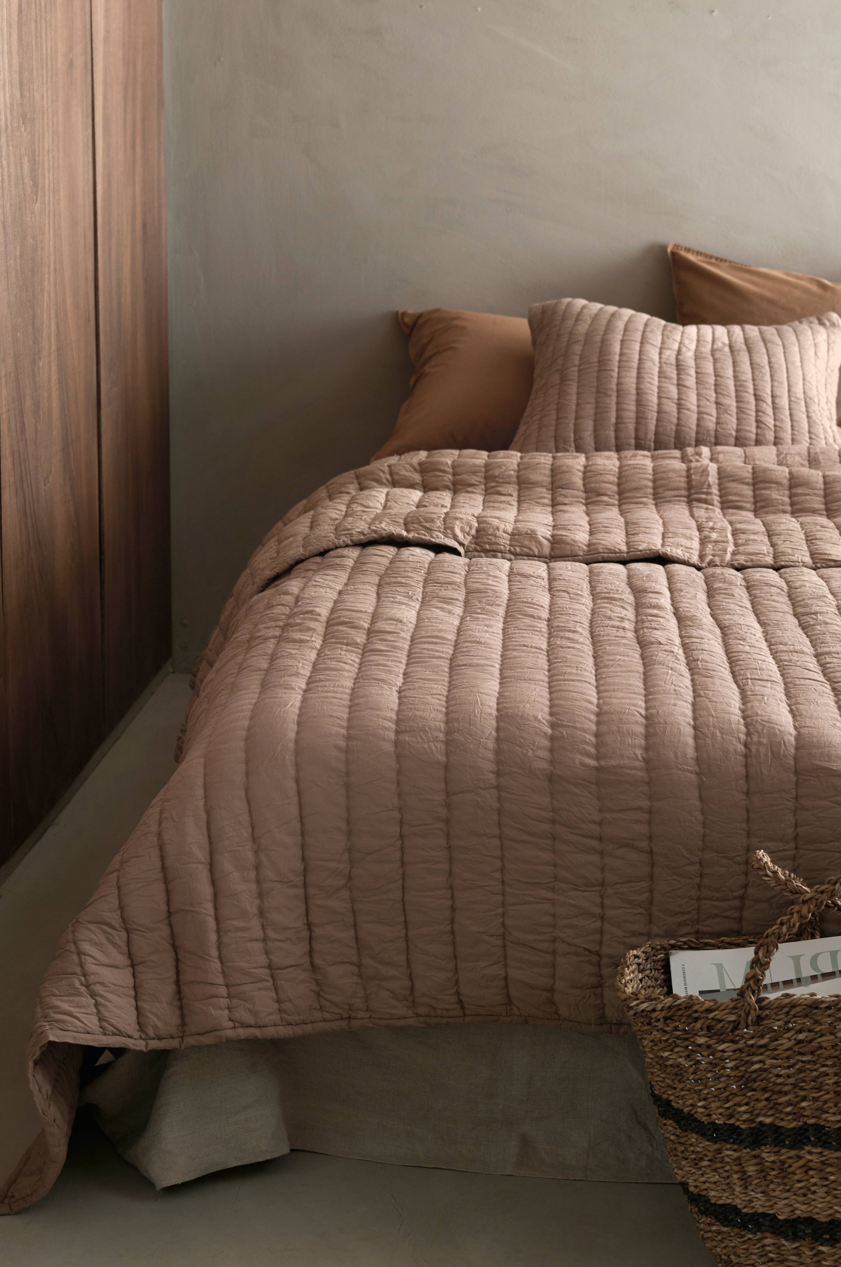 Käsin tikattu päiväpeite pehmeää, pestyä puuvillavoileeta. Reunusnauha ympäriinsä. Täyte 250 g puuvillaa.