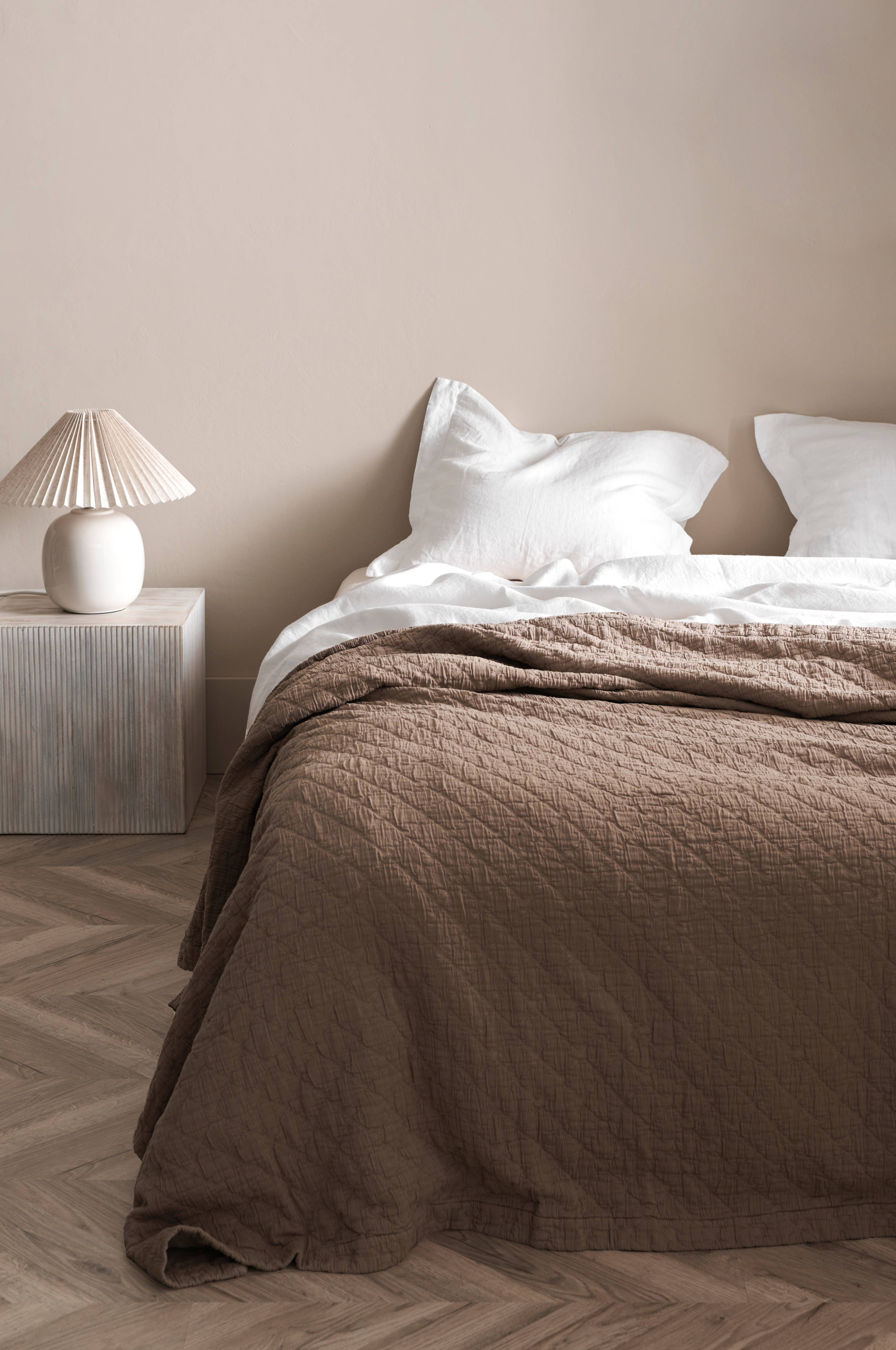 Päiväpeite pehmeäksi pestyä puuvillaa. Kaikilla sivuilla sauma ja 5 cm:n reunus.
