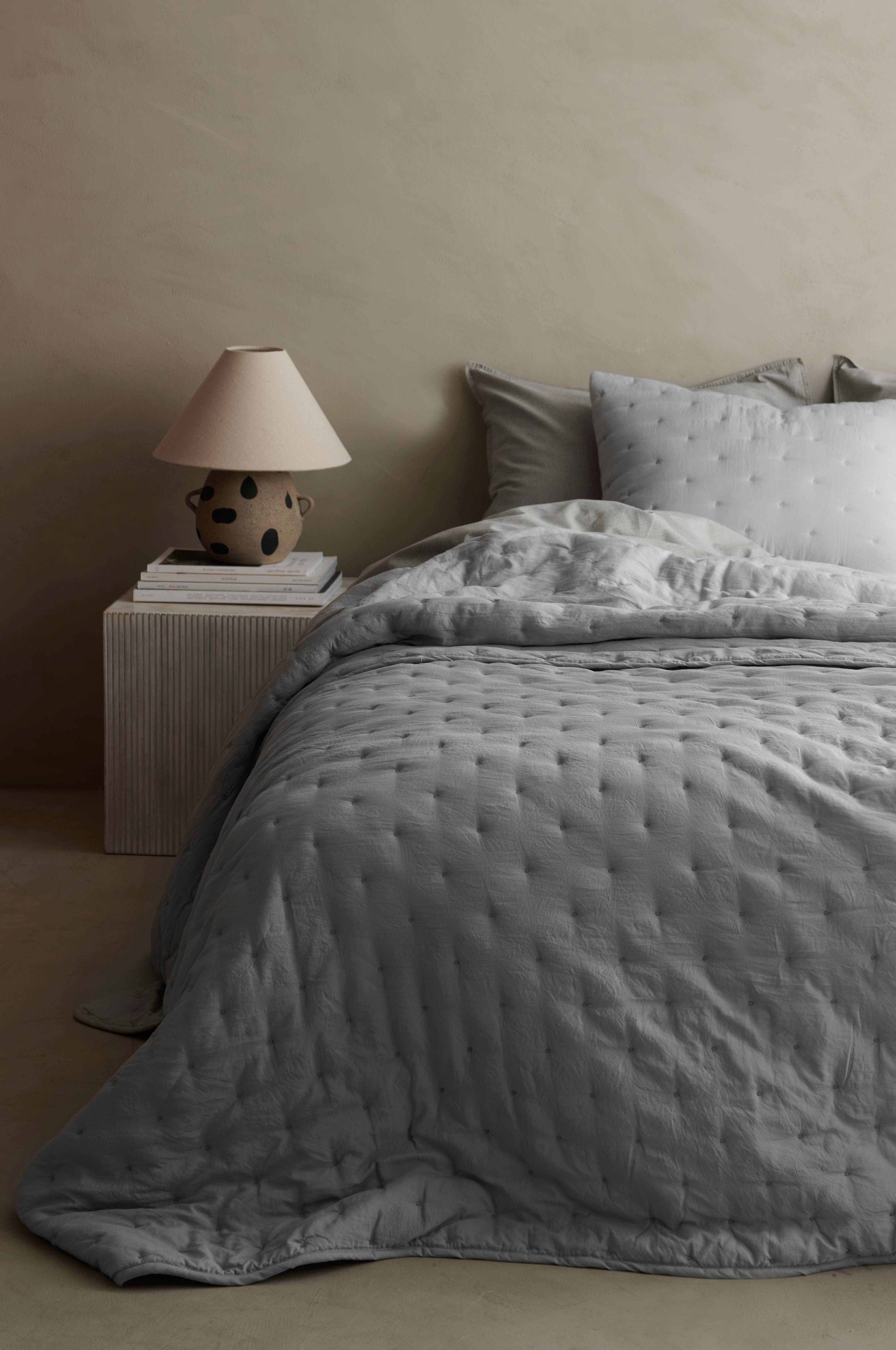 Tikattu päiväpeite pestyä materiaalia, jossa pehmeä mattapinta ja kirjailtuja pilkkuja molemmilla sivuilla.