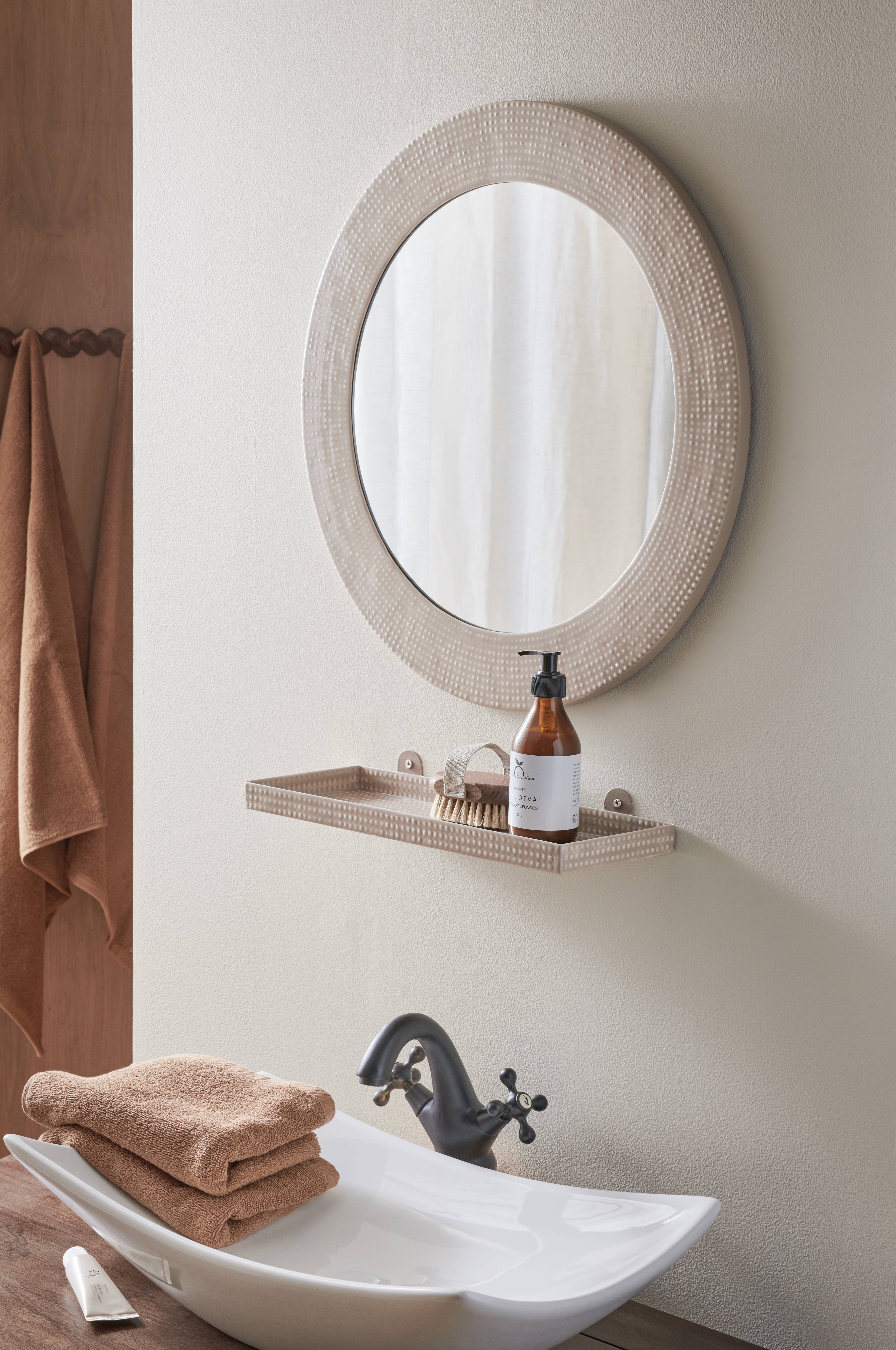 Pyöreä peili, jonka kehys maalattua metallia. Taottu kuvio. Tausta MDF-levyä. Peilin sisähalkaisija 40 cm. Ripustetaan seinälle.