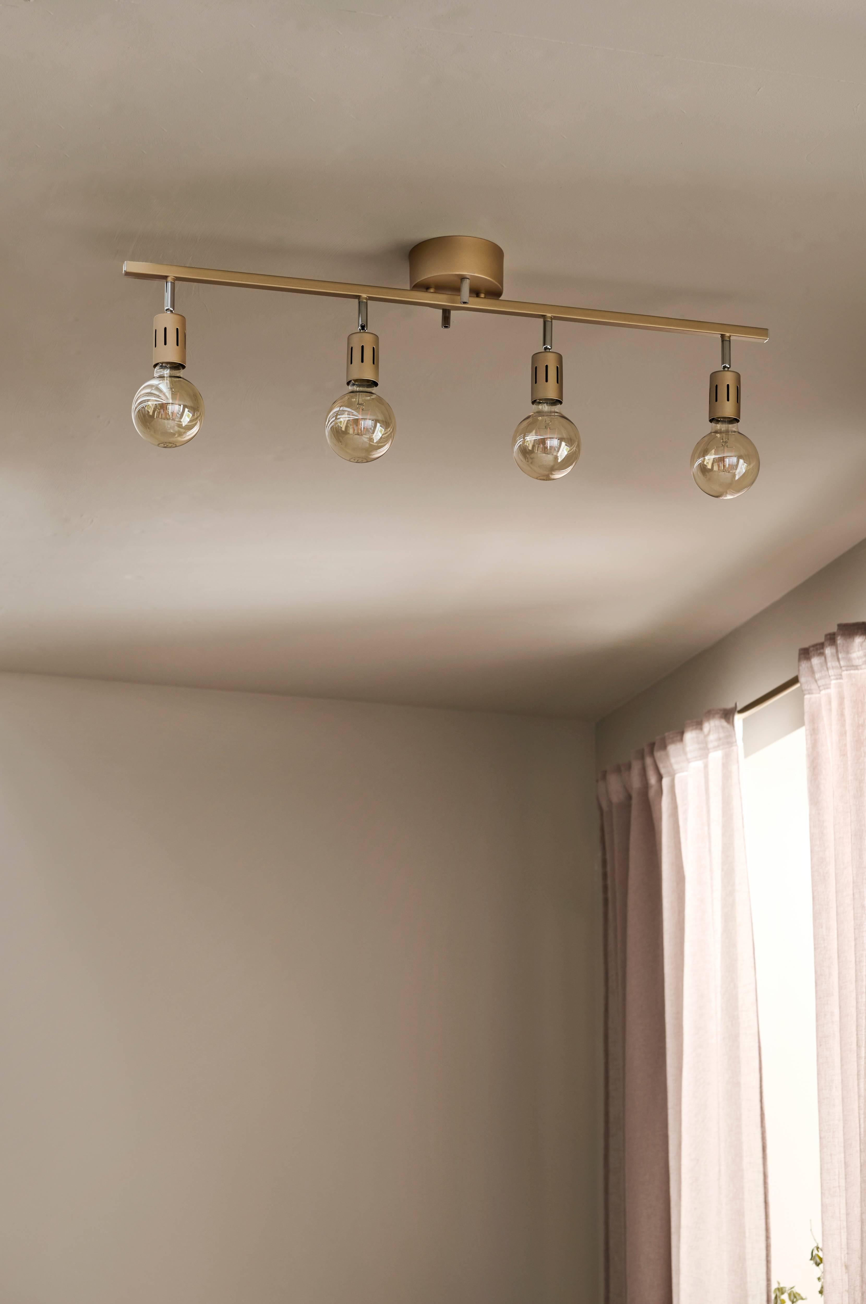Metallinen plafondi, jossa 4 säädettävää lamppua. Säädettävissä. Leveys 90 cm, korkeus 19,5 cm. Kattokupin halkaisija 13 cm. Asennetaan ripustuskoukun avulla. 4xE27.