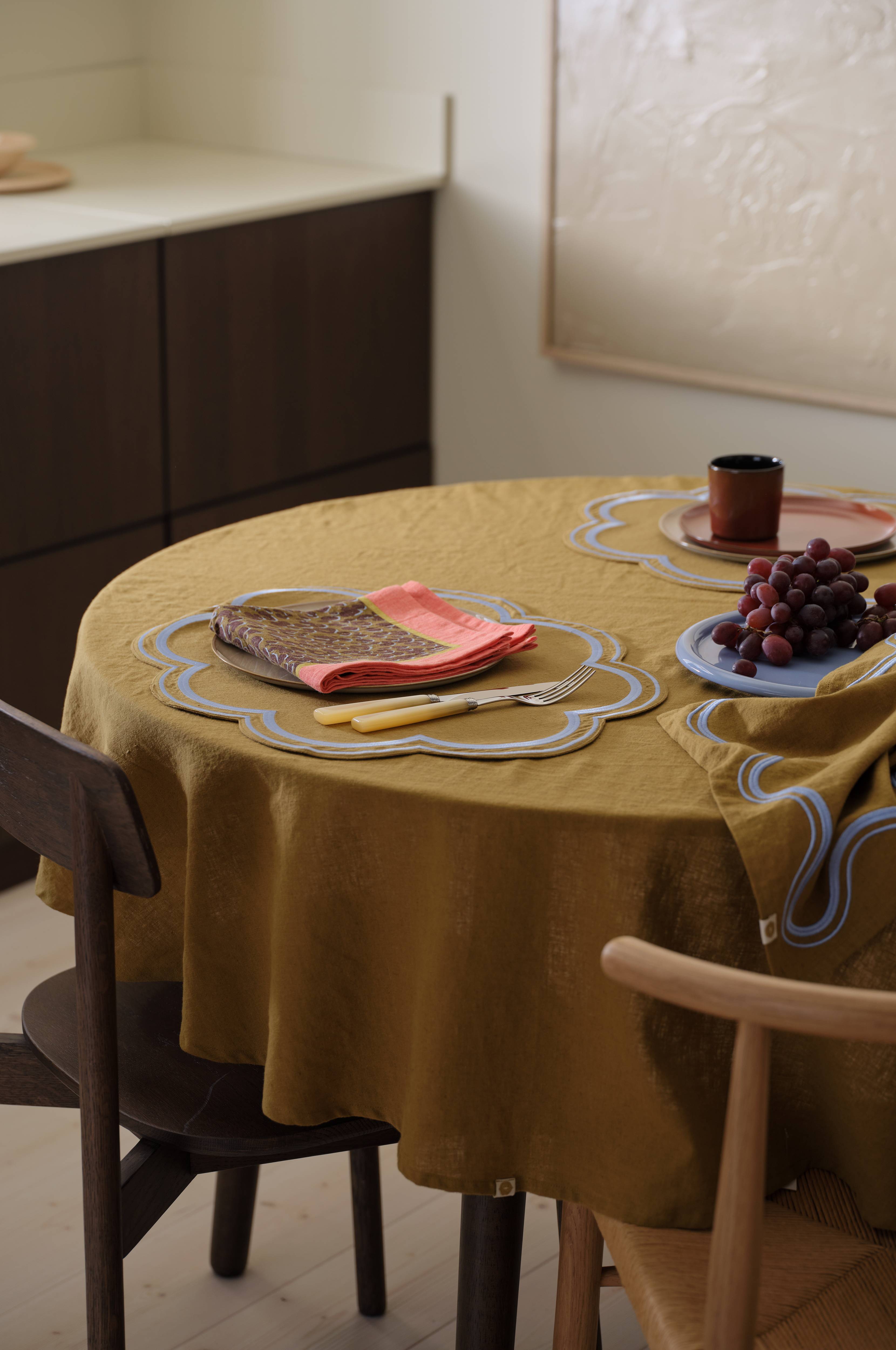 • Pyöreä, yksivärinen pöytäliina puuvillasta ja pellavasta pehmeällä, pestyllä huolittelulla