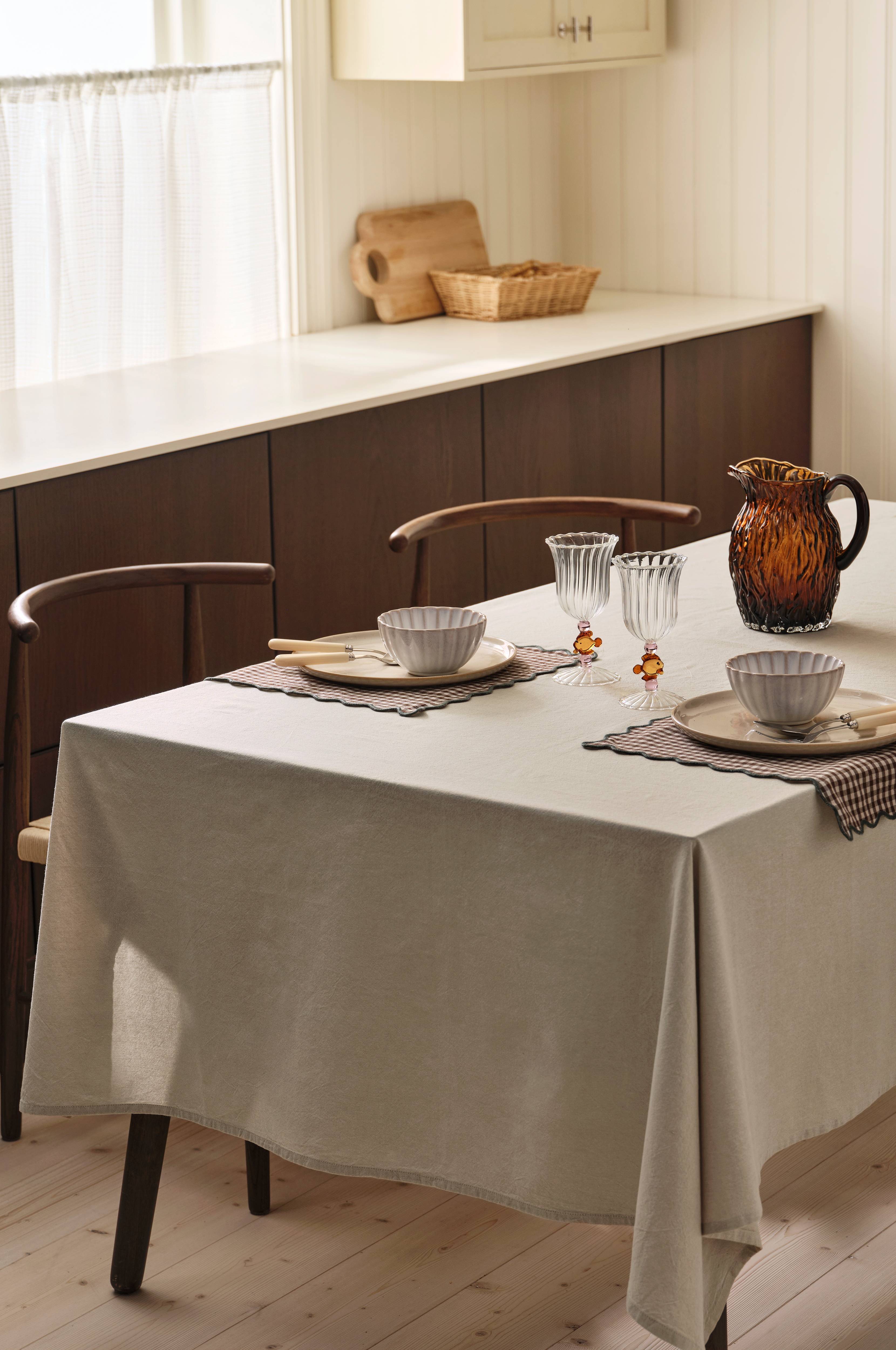 • Yksivärinen pöytäliina puuvillasta• Pehmeä, pesty huolittelu
