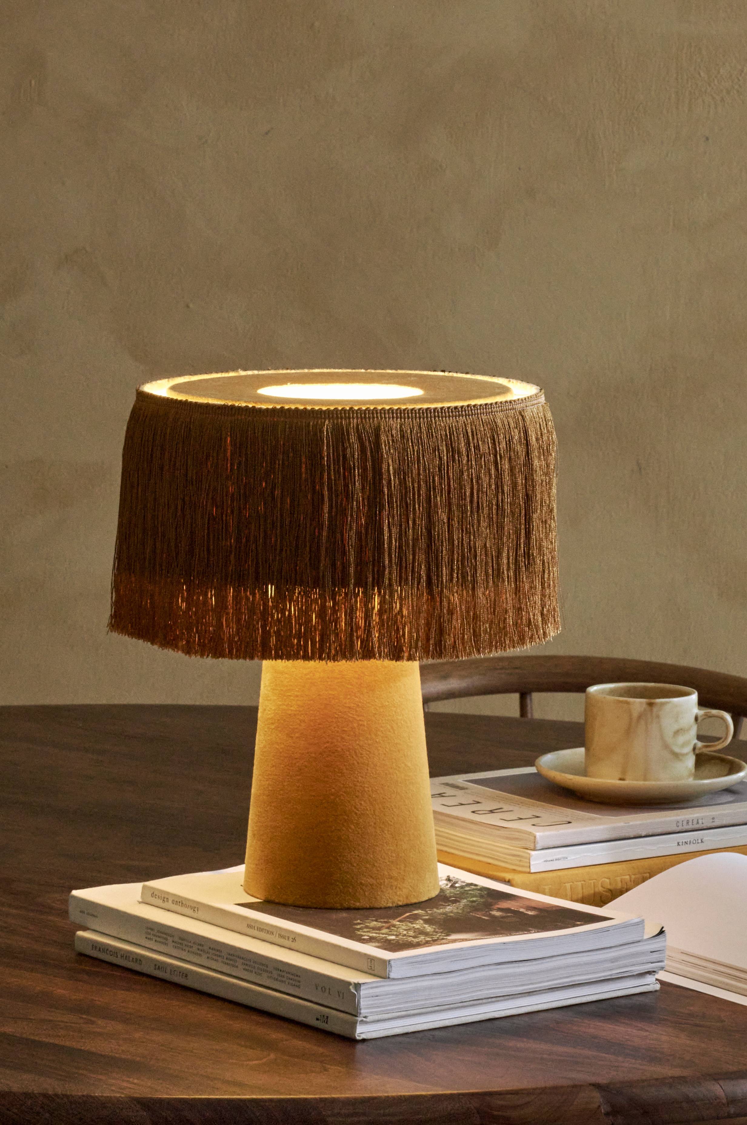 Pöytävalaisin, jossa varjostin ja lampunjalka sametilla päällystettyä polystyreeniä. Varjostimessa hapsut. Kangasjohto, jossa virtakatkaisin. Valonlähde ei sisälly toimitukseen.