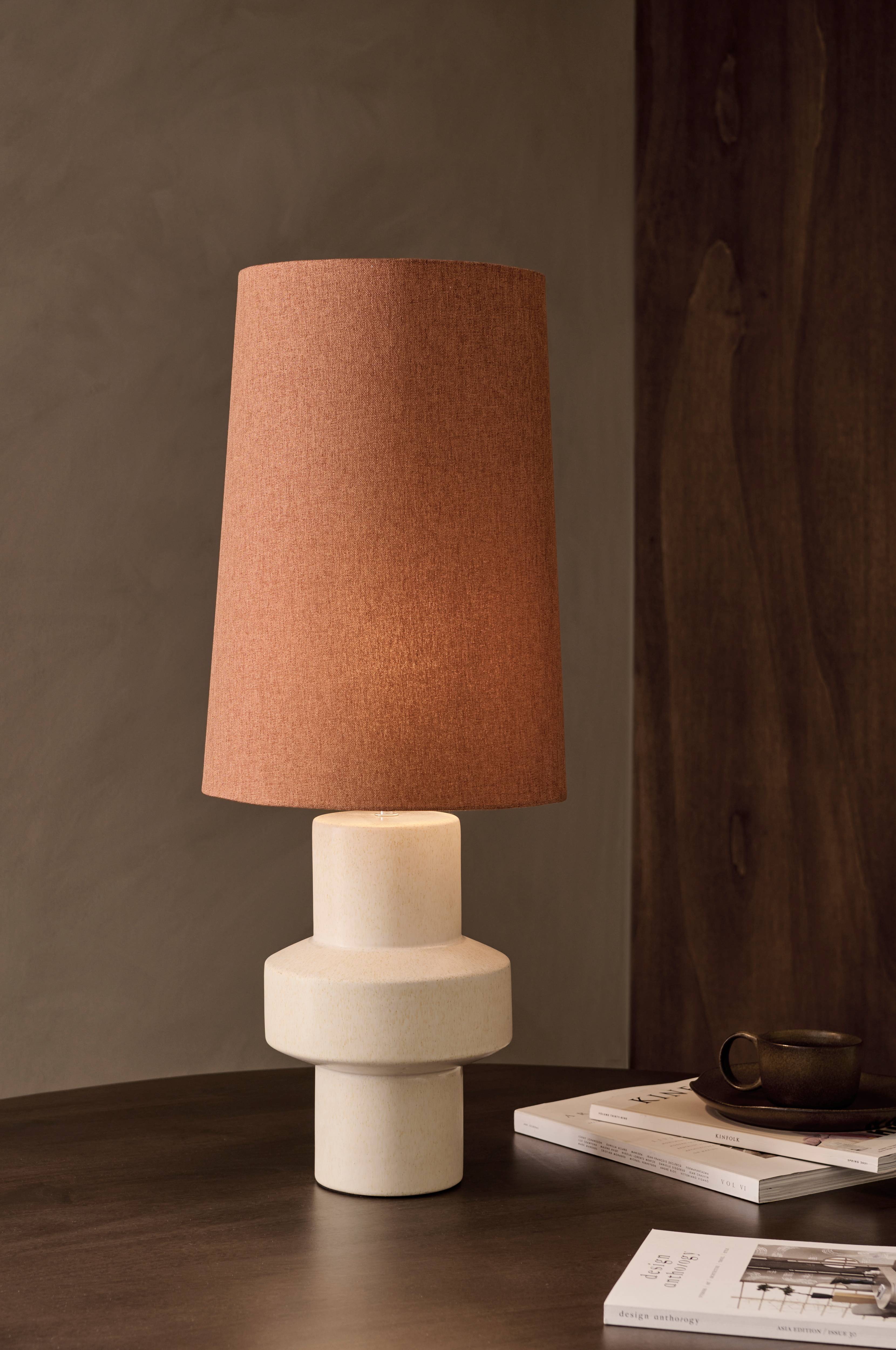 Retrohenkinen pöytävalaisin, jonka jalka lasitettua keramiikkaa. Korkea varjostin puuvillakangasta.