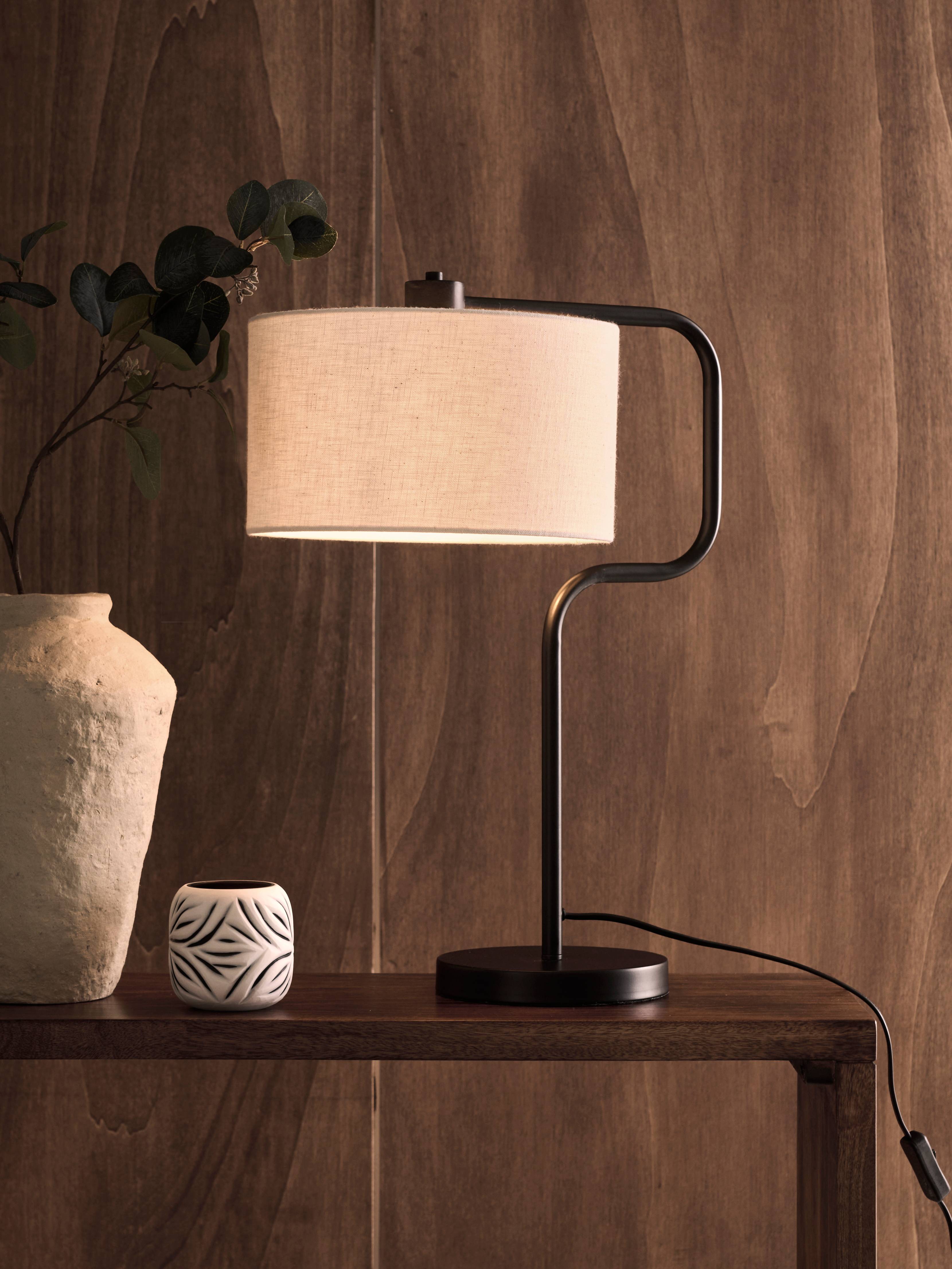 Pöytävalaisin, jossa metallijalka. Pellavavarjostin, jossa kevyt struktuuripinta.Varjostimen mitat: Halkaisija 28 cm, korkeus 16 cm.Musta johto, jossa virtakatkaisin. Valonlähde ei sisälly toimitukseen.