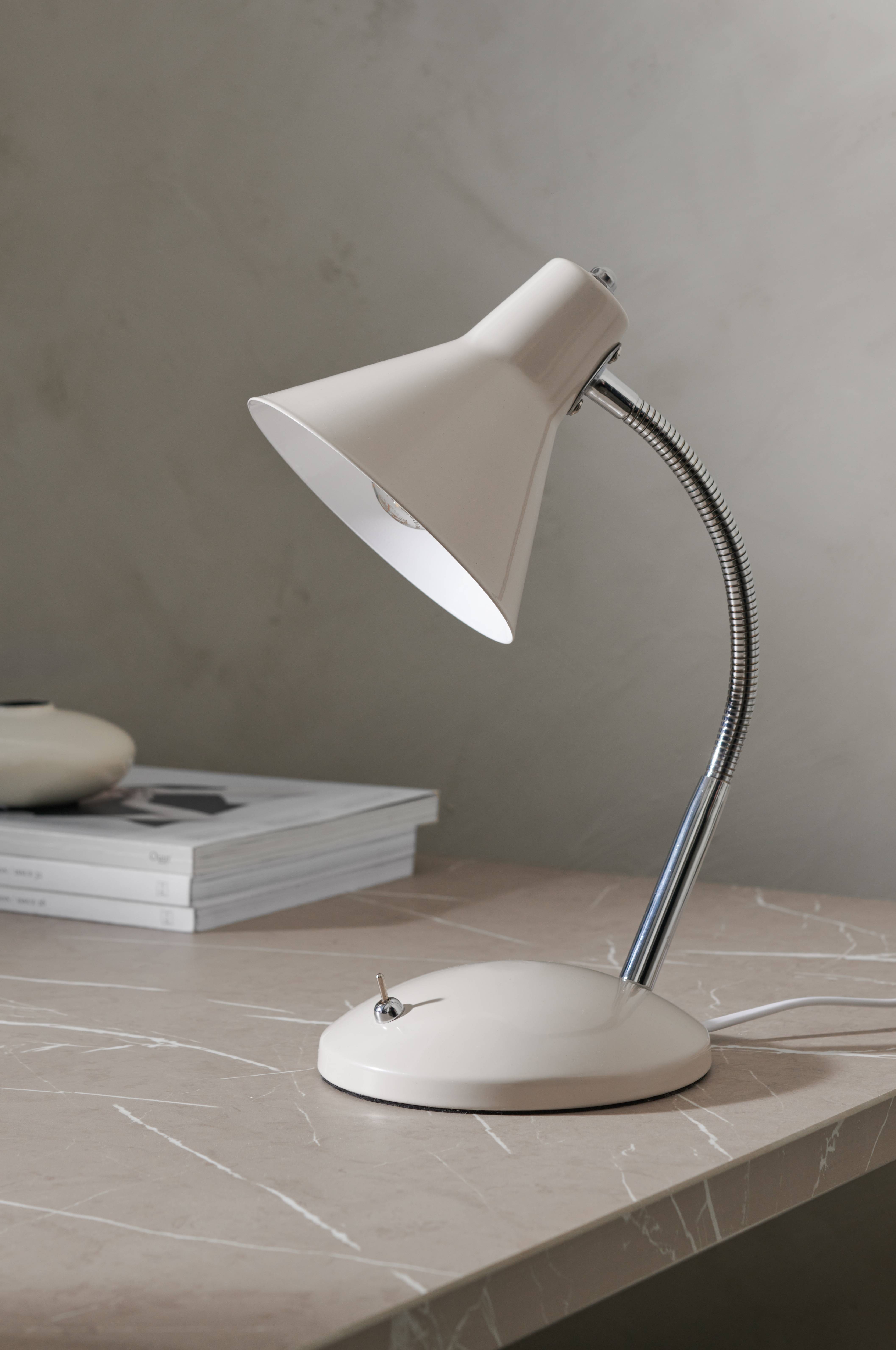 Retrohenkinen kirjoituspöytävalaisin maalattua metallia. Taivutettava varsi kromattua metallia. Virtakytkin lampunjalassa. Muovijohto. Varjostimen mitat: Halkaisija 14 cm, korkeus 13 cm. Jalan mitat: Halkaisija 12 cm, korkeus 3,5 cm. Valonlähde ei sisälly toimitukseen.