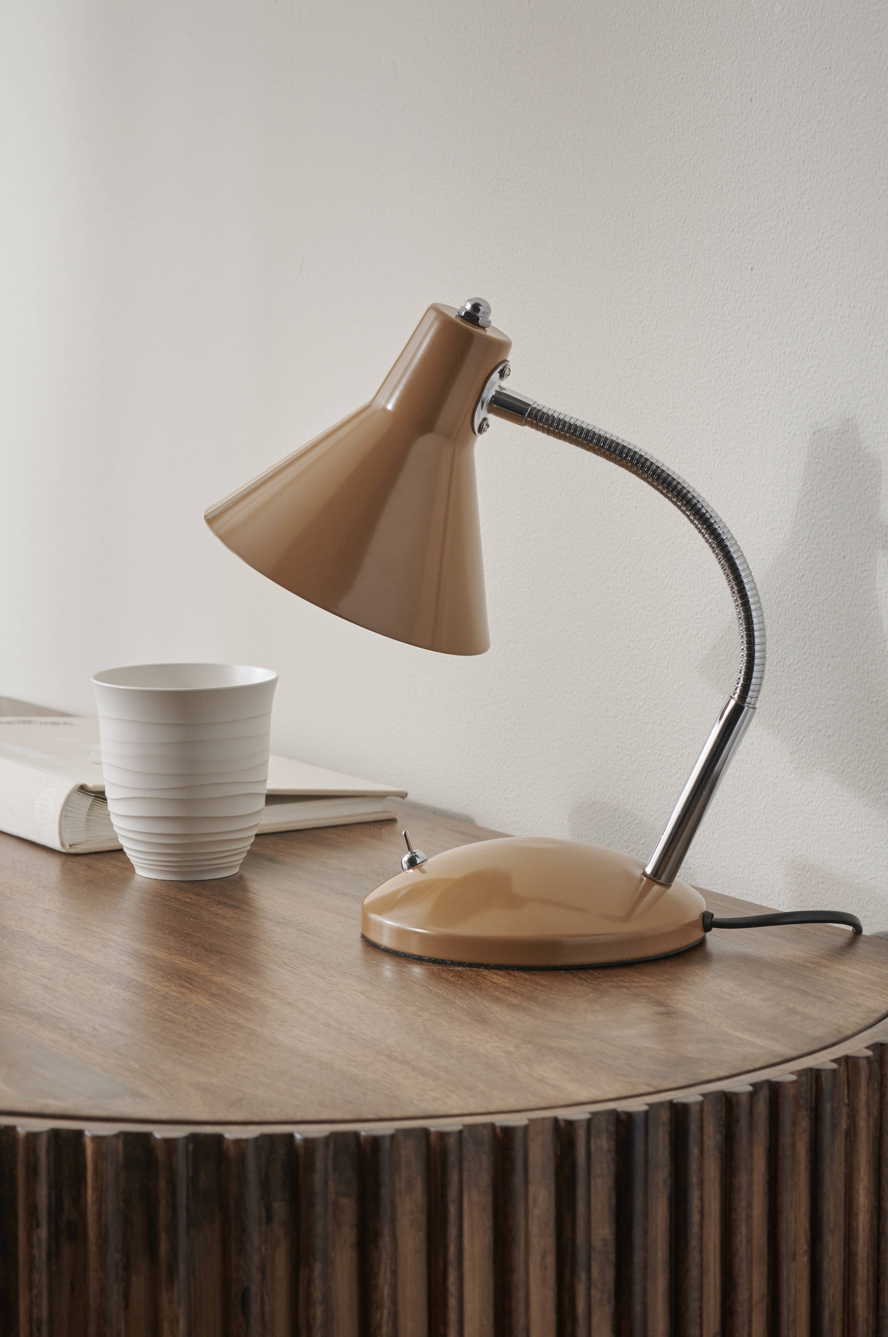 Retrohenkinen kirjoituspöytävalaisin maalattua metallia. Taivutettava varsi kromattua metallia. Virtakytkin lampunjalassa. Muovijohto. Varjostimen mitat: Halkaisija 14 cm, korkeus 13 cm. Jalan mitat: Halkaisija 12 cm, korkeus 3,5 cm. Valonlähde ei sisälly toimitukseen.