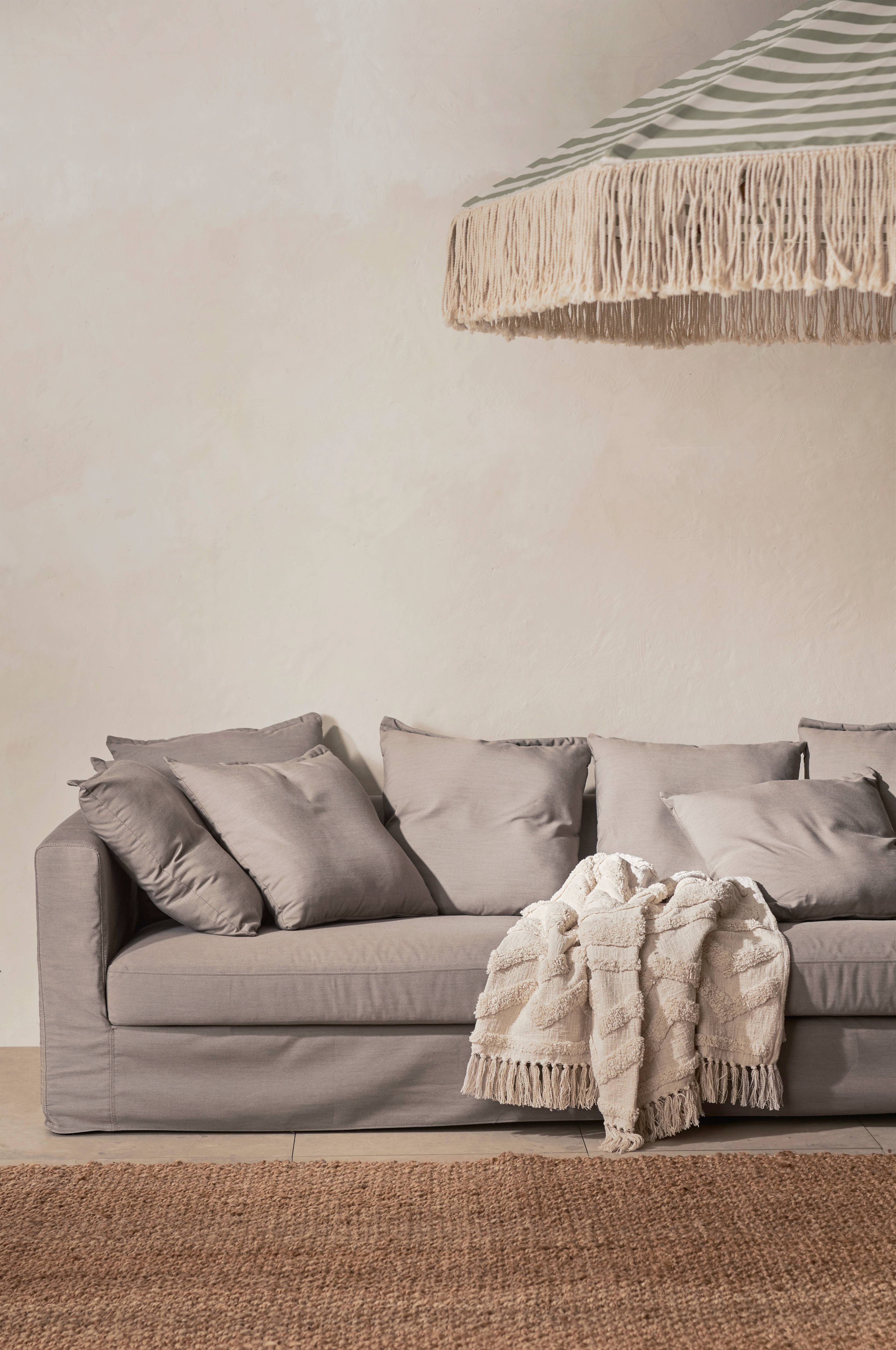 3:n istuttava sohva, jossa erittäin kevyt rakenne. Sohva kestää kaikenlaisia sääolosuhteita ympäri vuoden. Erittäin kevyt runko ja jalat ruostumatonta alumiinia. Ainutlaatuinen päällinen likaa- ja vettähylkivää läpivärjättyä Sunbrella-kangasta. Kankaan alla on pehmeä Quick Dry Foam -vaahtotäyte, joka kuivuu nopeasti ja päästää veden läpi niin, ettei sitä jää kalusteen sisälle. Materiaalien ansiosta kalustetta voidaan käyttää jo noin 45 minuutin kuluttua rankkasateen jälkeen. Likaahylkivä kangas on helppo pyyhkiä puhtaaksi, ja se voidaan myös huuhdella painepesurilla. Kangas kestää erinomaisesti kulutusta ja valoa (aurinkoa). Seitsemän irrallista selkätyynyä ja kaksi istuinpehmustetta. Rungon päällinen on irrotettava.
