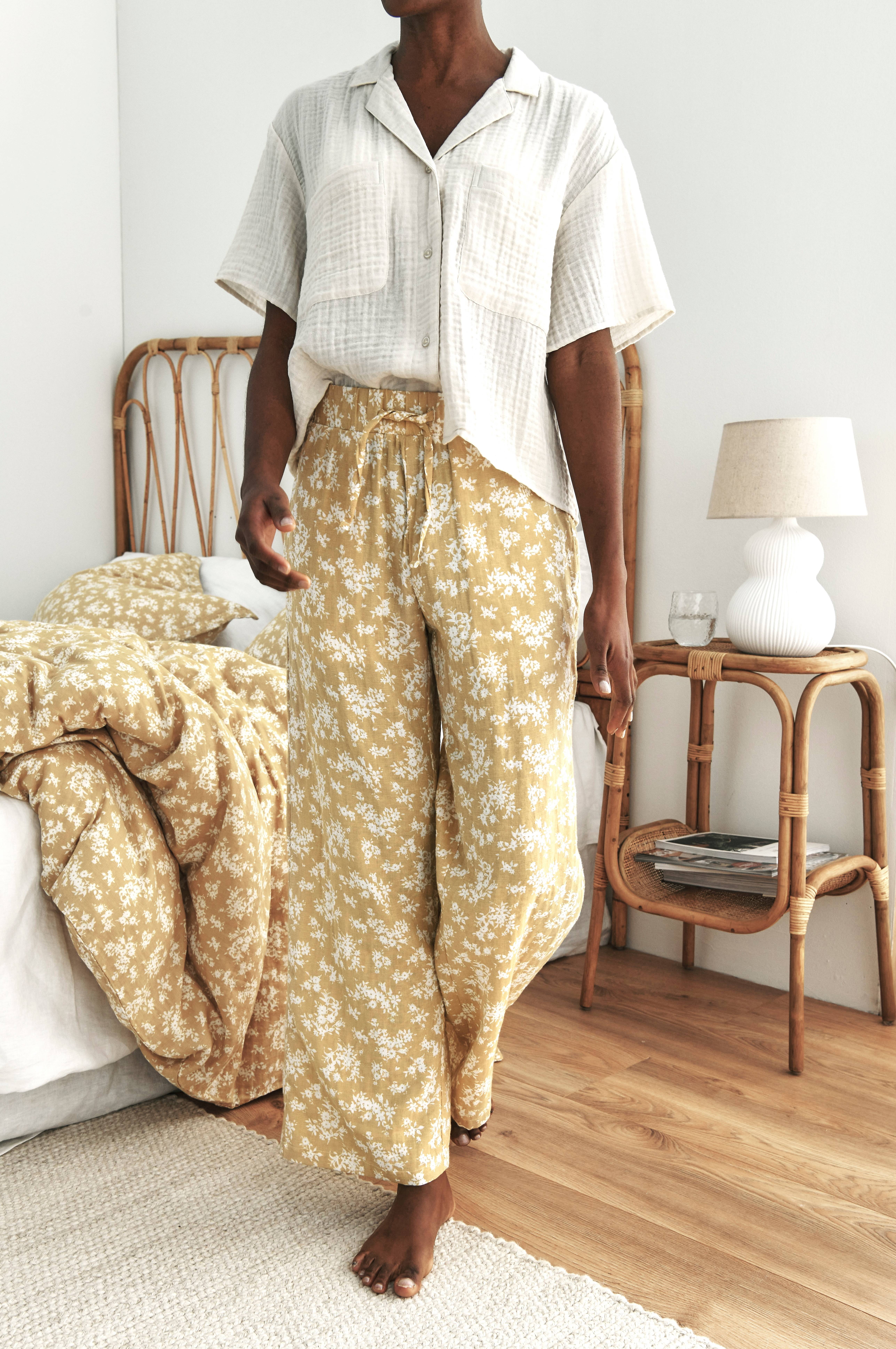 Pyjamahousut kaksinkertaista pestyä ekologista puuvillamusliinia. Kokopitkät, leveät lahkeet. Joustava vyötärö, jossa nyöri. Kaksi sivutaskua.