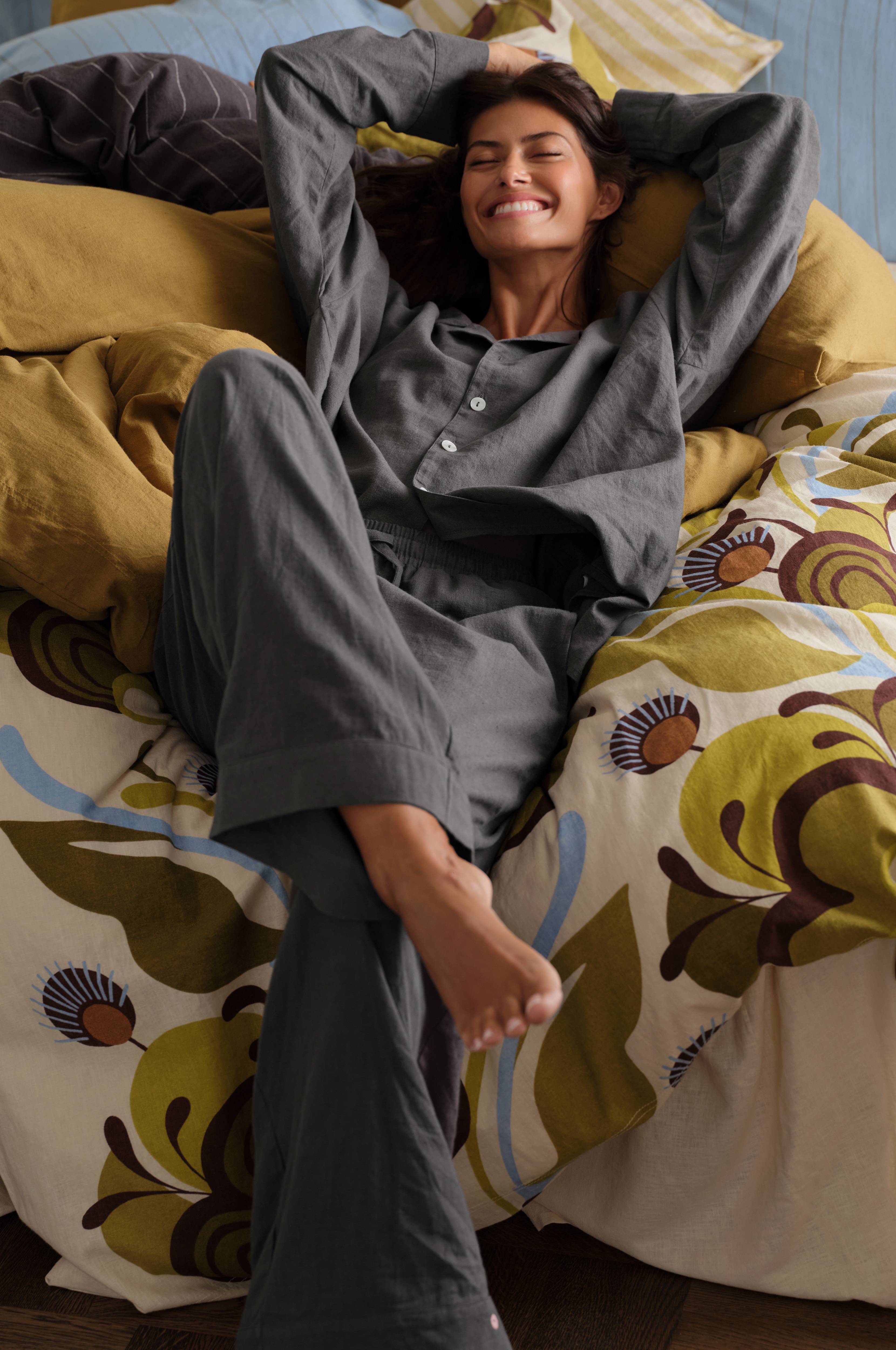 • Pyjamahousut puuvillasta ja pellavasta pehmeällä, pestyllä huolittelulla