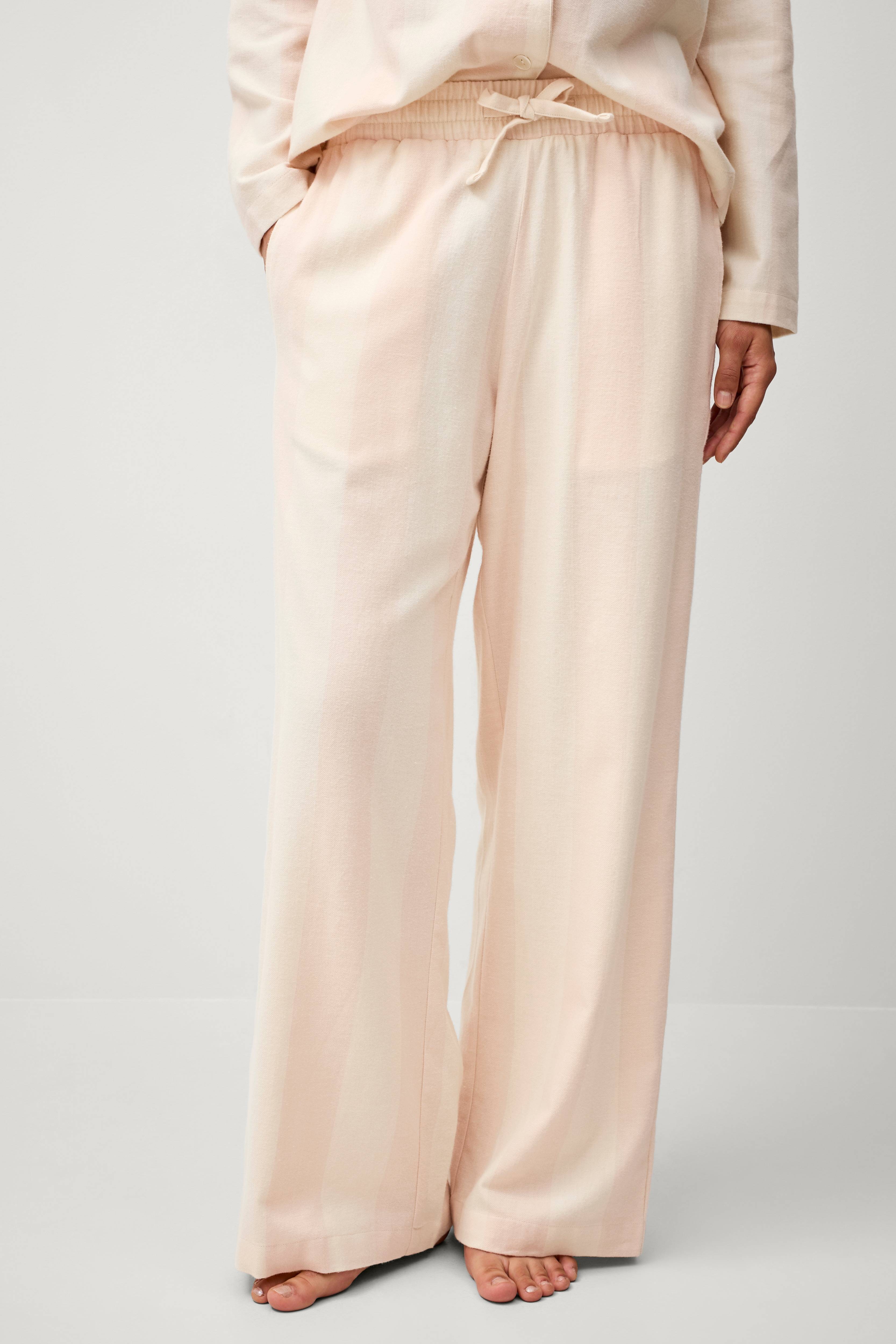 Pyjamahousut ekologisesta puuvillasta valmistettua flanellia, jossa on lankavärjätyt raidat. Pestyssä materiaalissa on pehmeä, harjattu pinta. Suora ja rento malli. Leveä, joustava vyötärö, jossa nyöri. Lahkeen sisäpituus 75 cm koossa S.