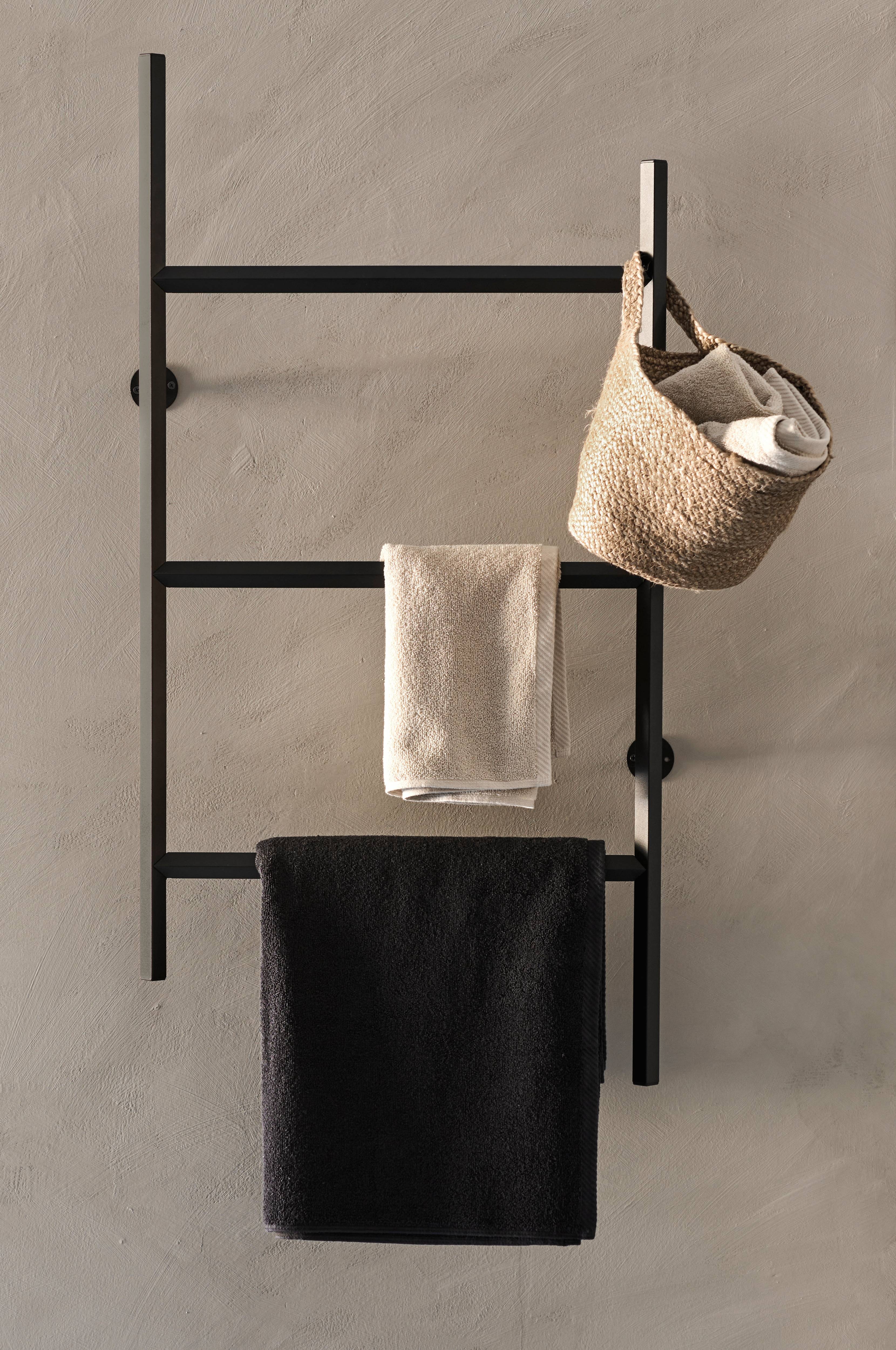 Seinälle kiinnitettävä pyyheteline. Mustaksi maalattua metallia. Telineessä ei ole lämmitystä. Toimitetaan koottuna.