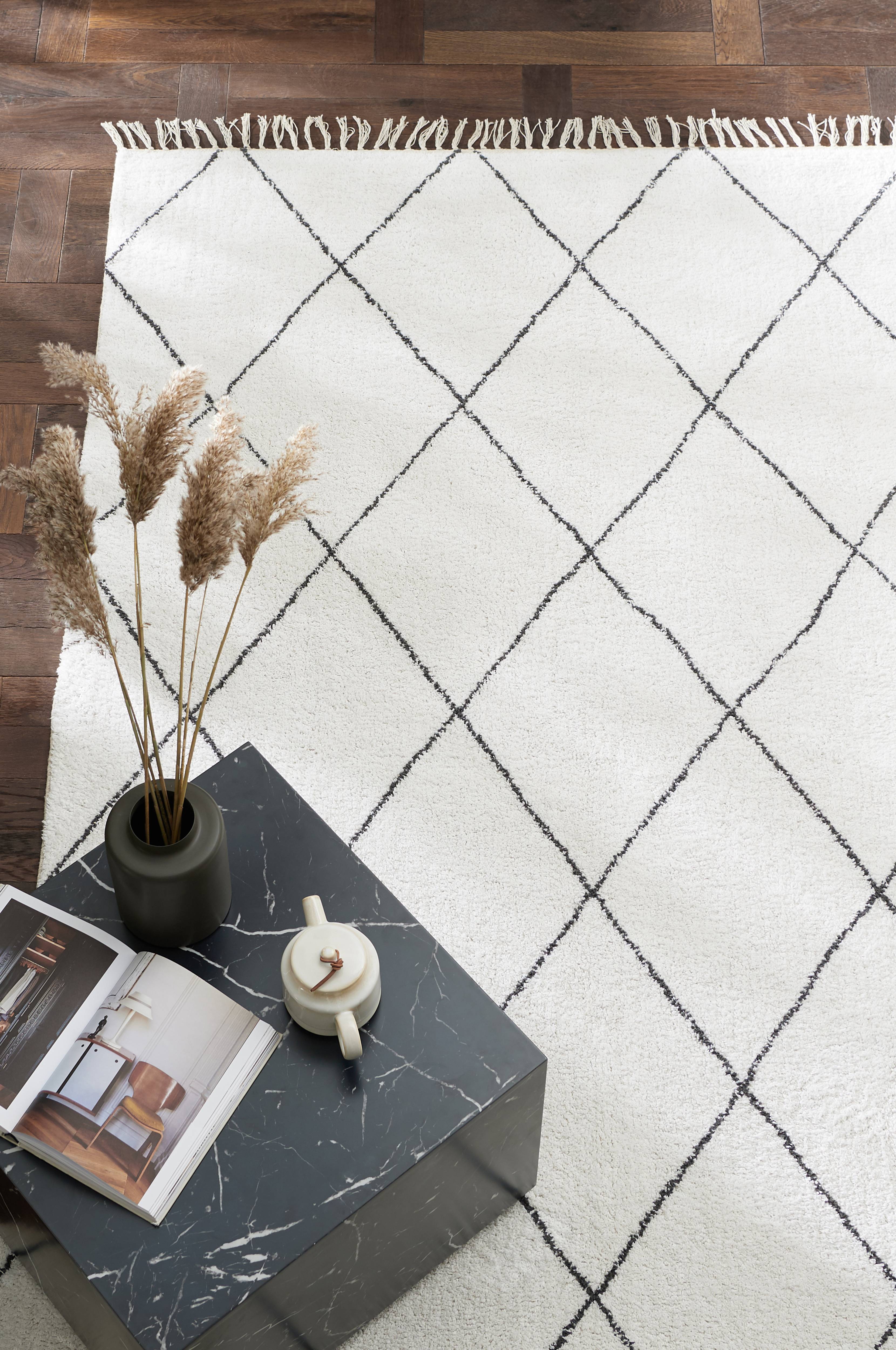 Lähes vitivalkoinen, joten sopii hyvin valkoiseen kotiin ja lattiaan, ei taita keltaiseen. Ihanan pehmeä ja laadukkaan oloinen. Valkoisen maton mustat viivat ovat läpivärjättyä lankaa eikä…