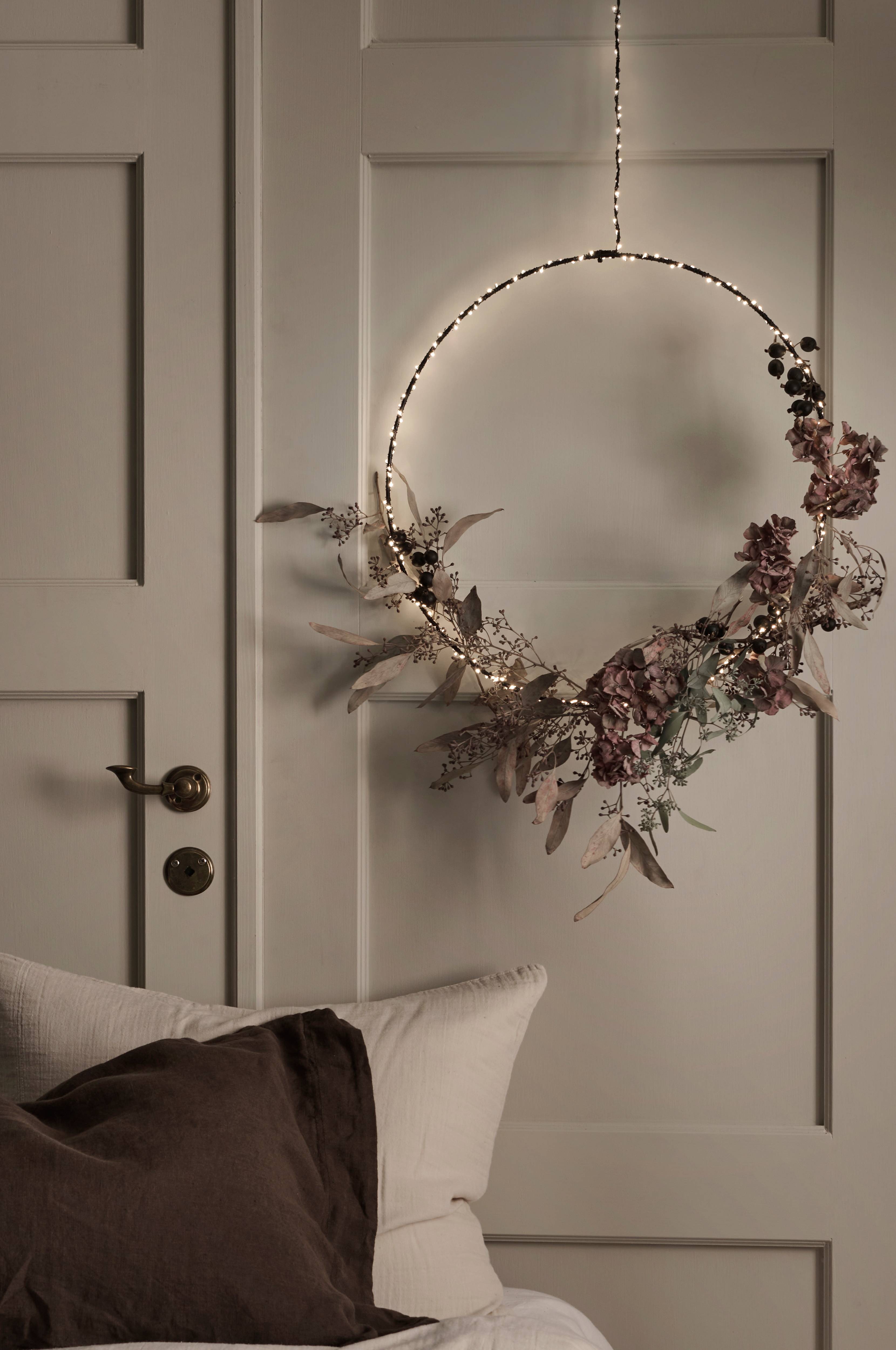 Riipuva Alpha-rengas, jossa 180 pehmeästi valaisevaa integroitua valonlähdettä. 3 metrin musta johto, jossa plug-in-muuntaja ja ajastin.