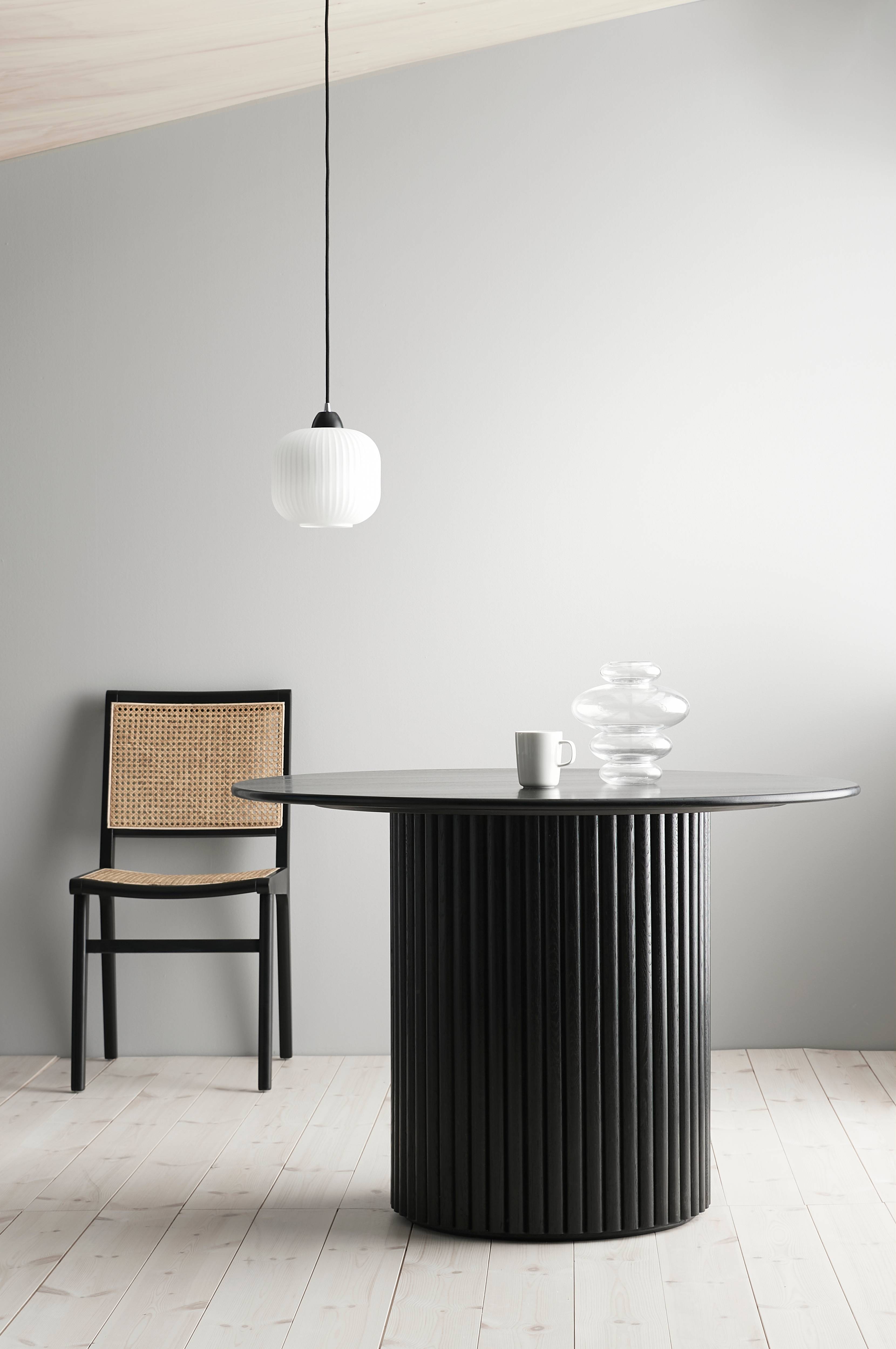 Pyöreä sohvapöytä massiivitammea. Pöytälevyssä pyöristetyt reunat. Pyöreä, vakaa jalka massiivipuuta ja MDF-levyä. Jalan ympärillä olevat rimat luovat pintastruktuurin. Käsitelty vesipohjaisella lakalla. Korkeus 75 cm, pöytälevyn halkaisija n. 110 cm. Jalan halkaisija 51 cm. Toimitetaan osina.