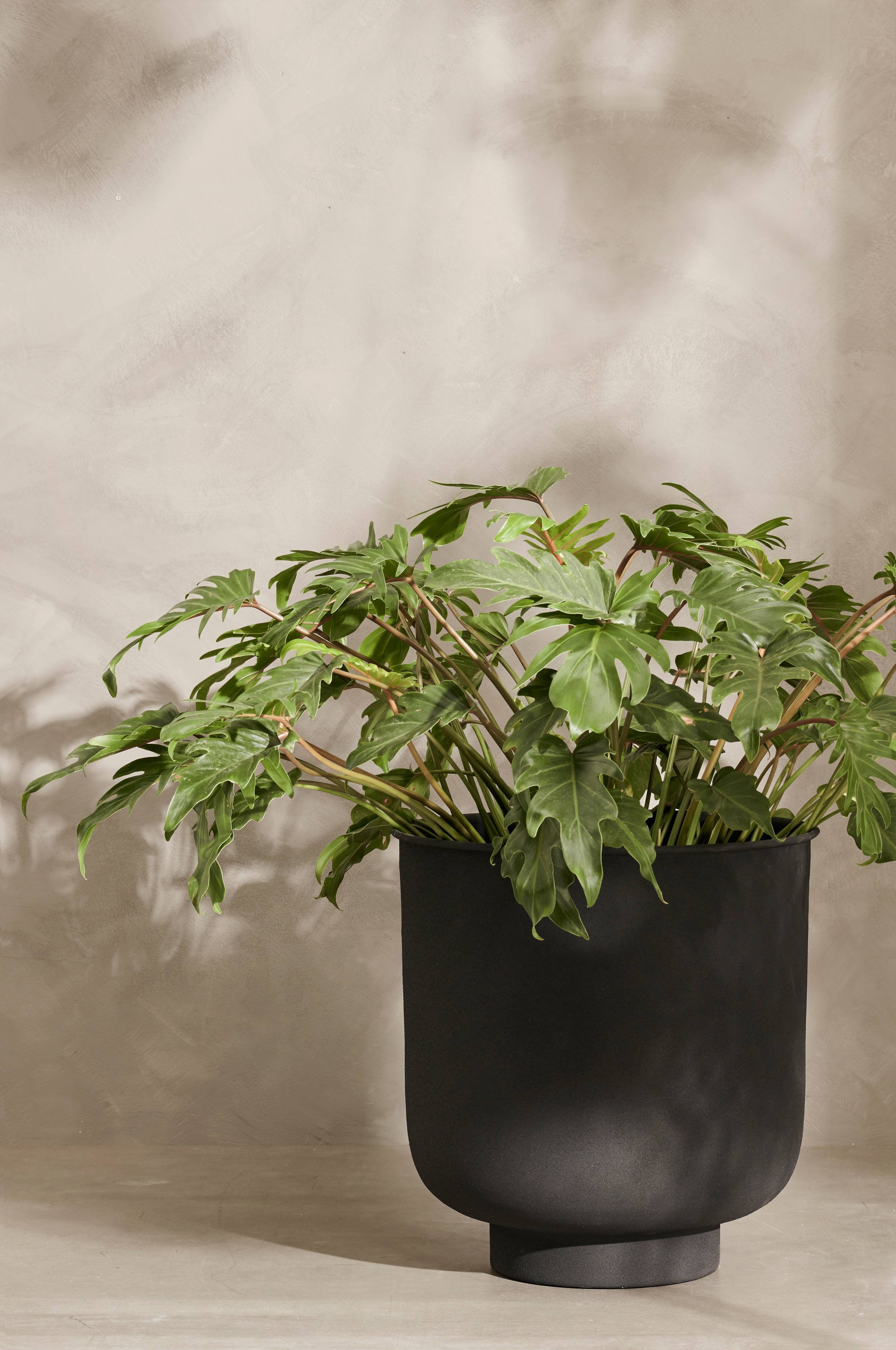 Ruukku metallia, jossa matta struktuuripinta. Ei aluslautasta. Korkeus 43 cm, Ø 41 cm. Ei reikää pohjassa. Sopii ulkokäyttöön.