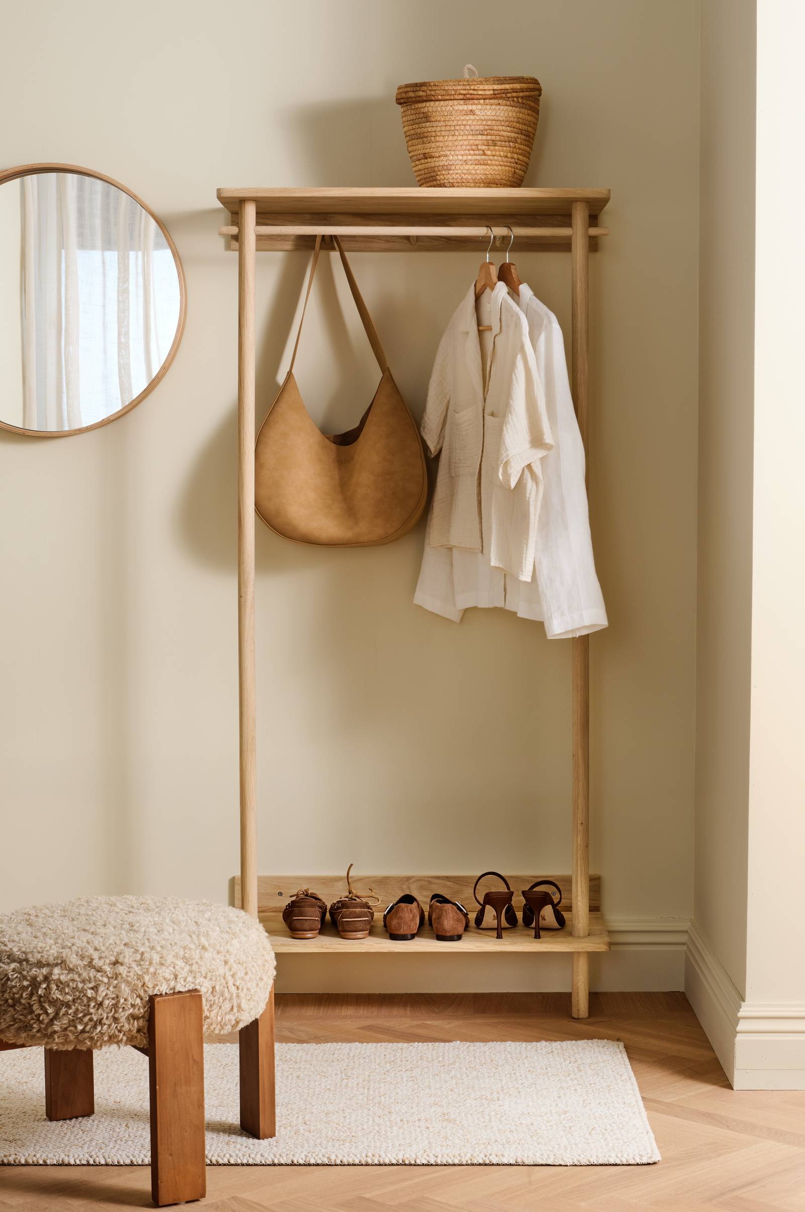 Eteiskaluste, jossa kenkä- ja hattuhylly sekä 5 koukkua. Öljyttyä tammea. Korkeus 170 cm, syvyys 34 cm, leveys 80 cm. Korkeus lattiasta ensimmäiseen hyllyyn 13 cm. Toimitetaan osina.