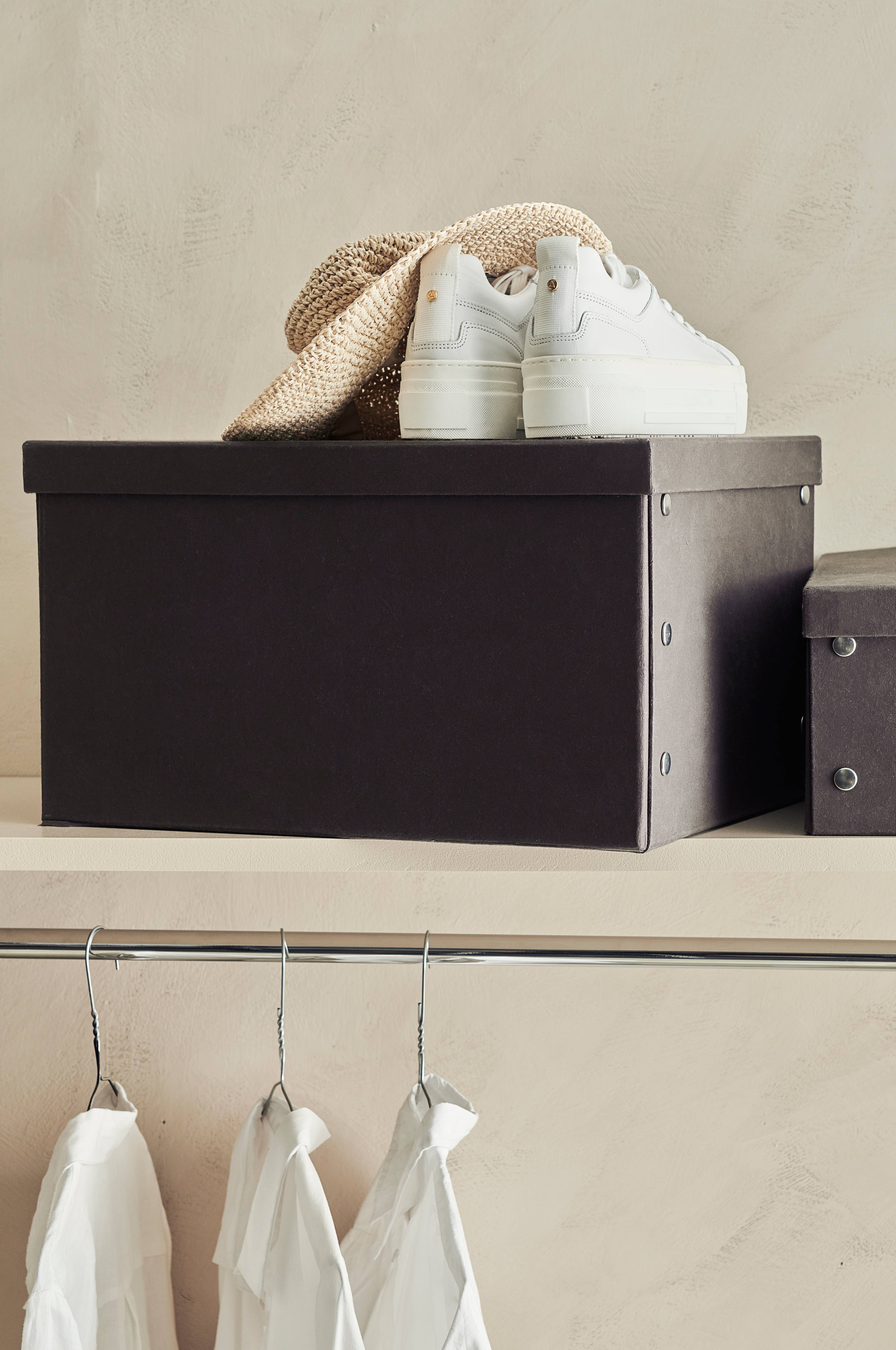 Kannellinen säilytyslaatikko. Valmistettu käsin kierrätetystä paperista/kartongista. Laatikko suljetaan painonappien avulla.