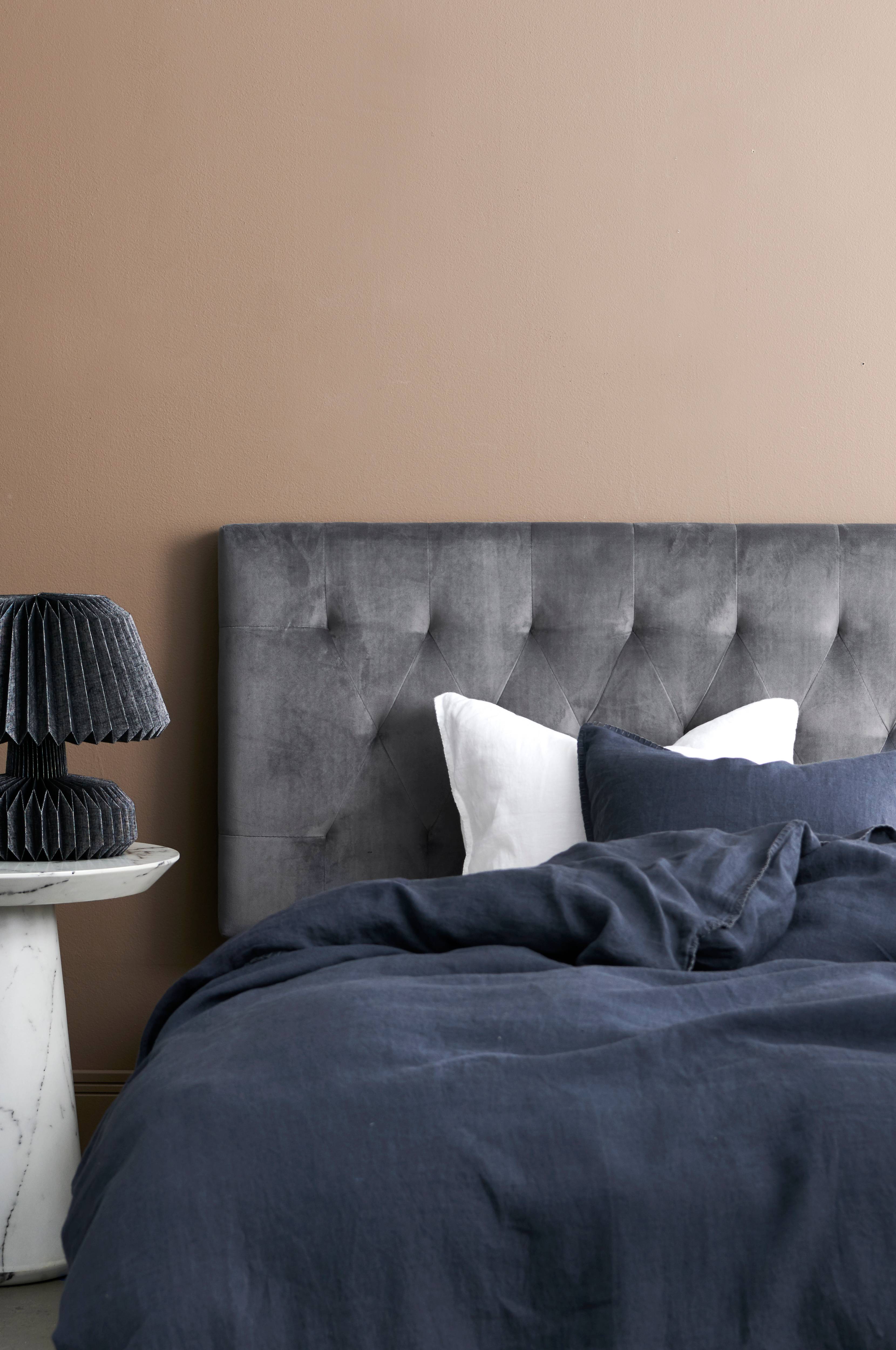 Pehmustettu sängynpääty, joka kiinnitetään seinään (mukana seinäkiinnikkeet). Runko puuta. Päällinen polyesterisamettia ja täyte vaahtomuovia. Leveys 125 cm, korkeus 61,5 cm, syvyys 7,5 cm.